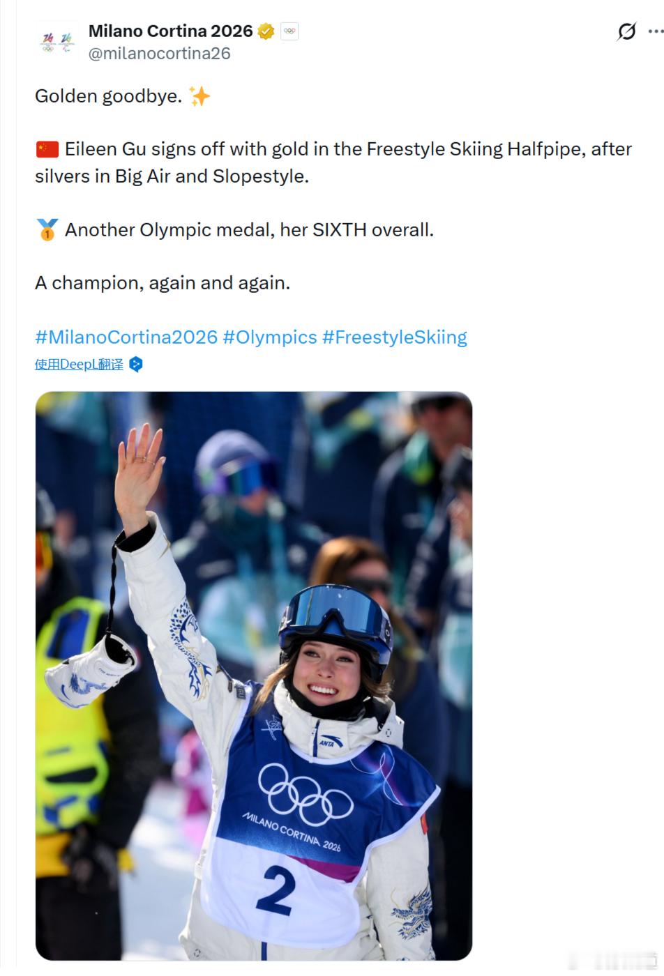 谷爱凌金牌米兰冬奥会官方号:完美收官。✨所谓冠军,便是在巅峰之上,复刻巅峰。🇨🇳 谷爱凌在自由式滑雪U型场地项目中以一枚金牌收官,此前她已在大跳台和坡面障碍技巧项目中获得银牌。🥇 又一枚奥运奖牌——这是她个人的第六枚奥运奖牌。传奇,在冰雪间一次又一次地加冕。冬奥会