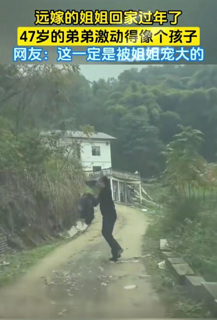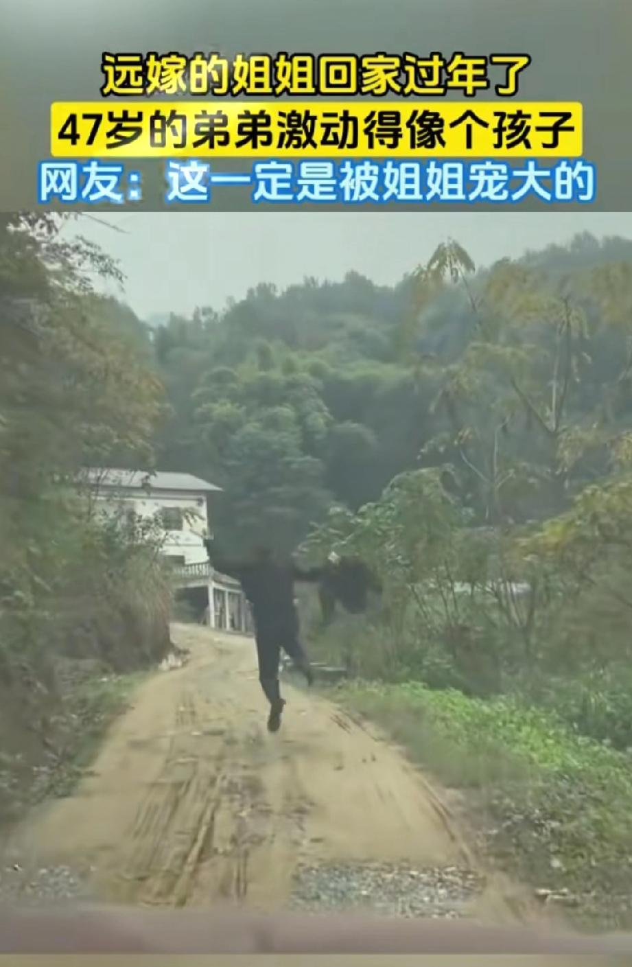 泪目!远嫁的姐姐过年回娘家,车子刚到村口,47岁的弟弟早已等候在此。他一路蹦蹦跳跳在车前领路,姐姐拍着视频,笑着笑着就红了眼眶。网友:这一定是被姐姐宠大的 姐姐远嫁他乡,过年回娘家。车子刚到村口,就看到弟弟早就等在那里了。他没上车,就那么在前面蹦蹦跳跳地领路,开心得像个孩子。 走着走着回头冲车子招手:跟上,跟上,快到家了。 有网友说:“只有经历过那个年代且多姊妹的人才深有体会!现在的独生子女完全不懂那个吃不好穿不好年代的姐妹感情! 想想八九十年代的农村,一家四五个孩子是常事。大的带小的,小的穿大的剩的衣裳。姐姐放学回来要背弟弟,弟弟挨欺负了姐姐第一个冲出去。那时候哪有什么零花钱,姐姐攒的几毛钱,都买了冰棍分给弟弟吃。 弟弟长大了,娶媳妇了,有了自己的家。可在姐姐面前,他永远是那个跟在她身后的跟屁虫。 说实话,现在这个社会,人情味越来越淡了。 兄弟姐妹各奔东西,一年见不了几面。过年回家,也就是吃顿饭的工夫,各玩各的手机。有的为了争家产,闹得老死不相往来。 可这个视频里的弟弟,用最朴实的动作,告诉我们什么叫手足情深。 他没说什么“姐姐我想你”,可那蹦蹦跳跳的样子,比说一万句话都让人感动。他没做什么惊天动地的大事,可那份发自内心的喜悦,谁都看得见。 姐姐在车里笑着笑着就哭了,是因为她知道,不管走多远,这里永远有个人在等她回家。 为什么偏偏是姐姐和弟弟? 不知道你发现没有,姐姐和弟弟的感情,总是特别深。 姐姐是家里的老大,从小就要照顾弟弟。弟弟挨欺负了,姐姐护着;弟弟饿了,姐姐喂着;弟弟哭了,姐姐哄着。在弟弟眼里,姐姐有时候比妈还亲。 等长大了,姐姐出嫁了,弟弟心里空落落的。那份依赖和牵挂,一辈子都改不了。 视频里那个47岁的弟弟,蹦跳的样子像个小学生。因为在姐姐面前,他永远可以做个孩子。哪怕他已经两鬓泛白,哪怕他在村里开了二十年拖拉机,是家里的顶梁柱。 可在姐姐眼里,他也永远是那个需要照顾的弟弟。 姐姐在视频里配了一句话:“远嫁半年的姐姐回家过年了,47岁的弟弟,激动的像个孩子。” 这句话看着简单,可仔细想想,里面藏着多少感情。 远嫁的路,隔山隔水,却隔不断血脉里的牵念。姐姐是弟弟成长路上的守护者,如今岁月流转,这份守护化作了双向的奔赴——姐姐归乡的脚步,弟弟翘首的期盼,都是对“团圆”最动人的注解。 远嫁姐姐回家47岁弟弟激动得像孩子 天南地北大拜年