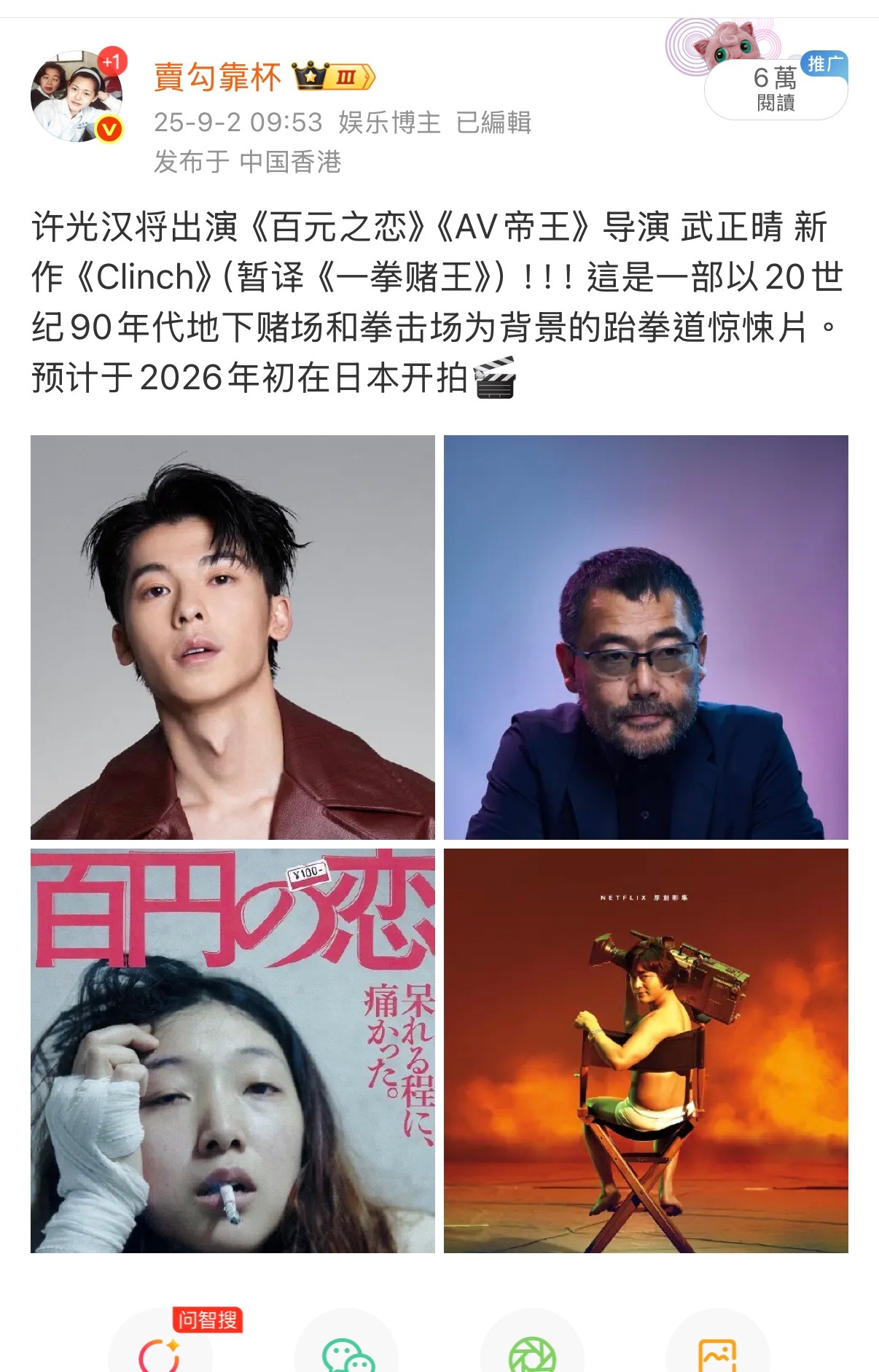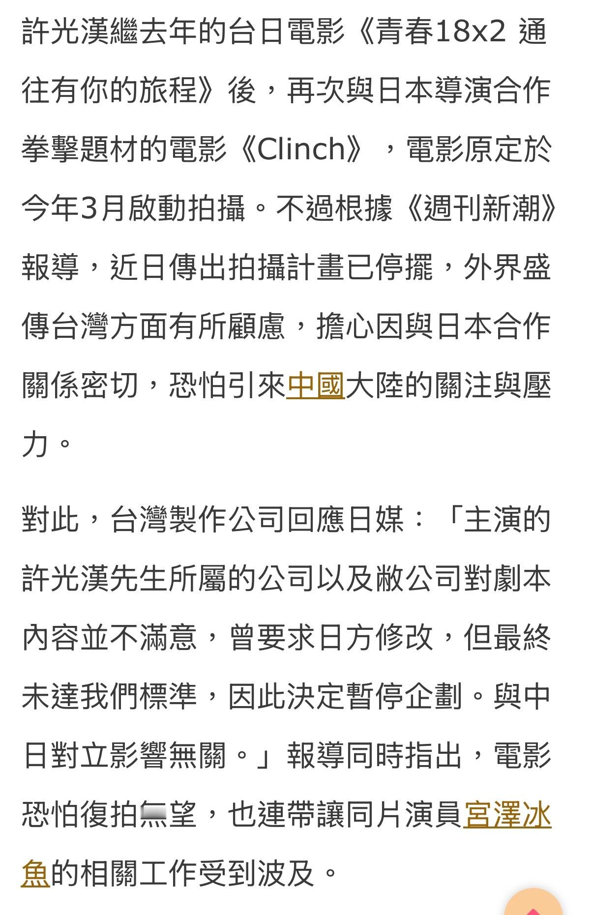 日媒「周刊新潮」报导许光汉新片《Clinch》拍摄计划停摆!说是外界盛传台湾方面有所顾虑,担心因与日本合作关系密切,恐怕引来中国大陆的关注与压力。