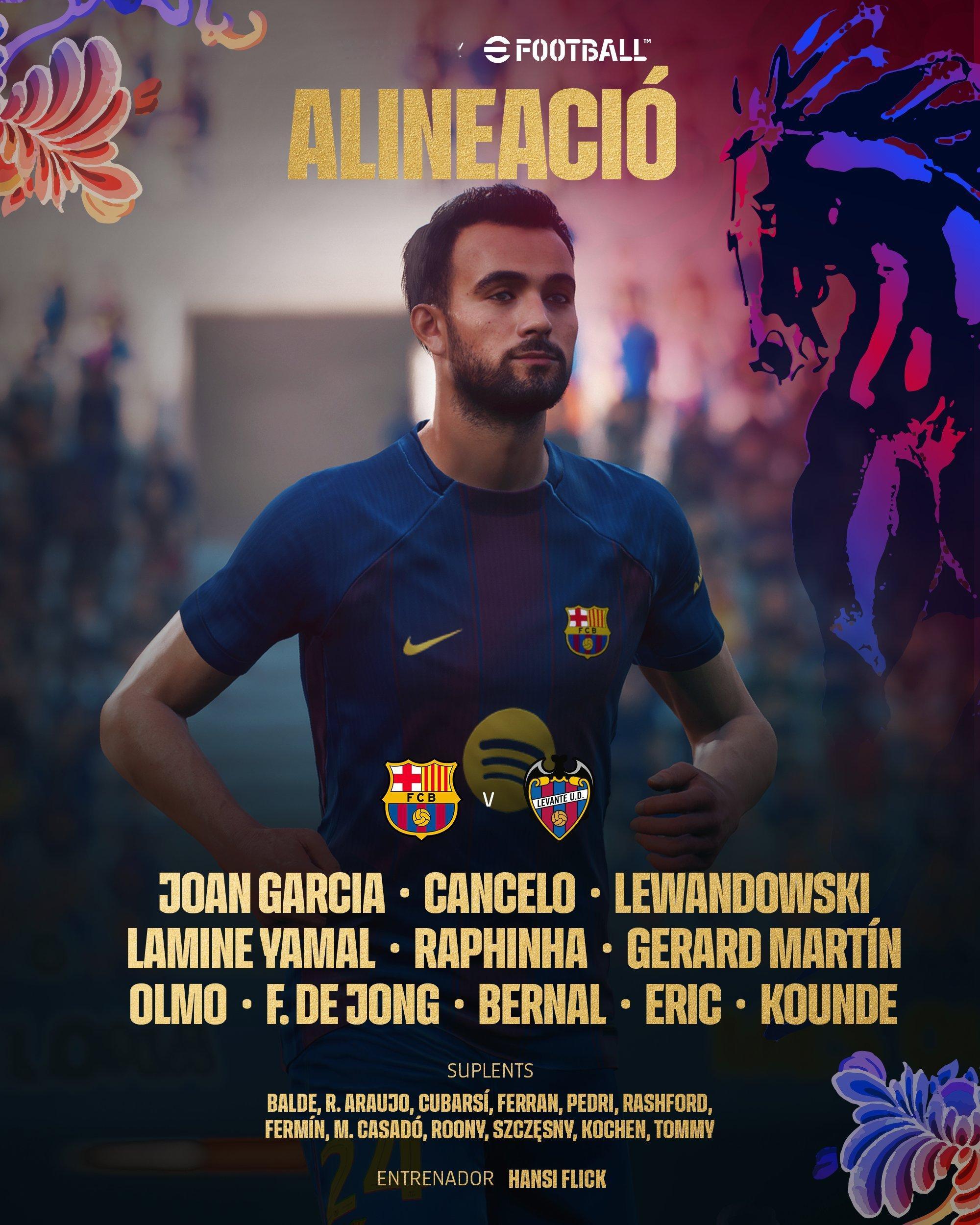 巴萨VS莱万特首发阵容🔥胡安-加西亚,孔德,埃里克-加西亚,杰拉德-马丁,坎塞洛,德容,伯纳尔,奥尔莫,亚马尔,莱万多夫斯基,拉菲尼亚。❤️💙巴萨vs莱万特巴萨至死不渝红蓝魂