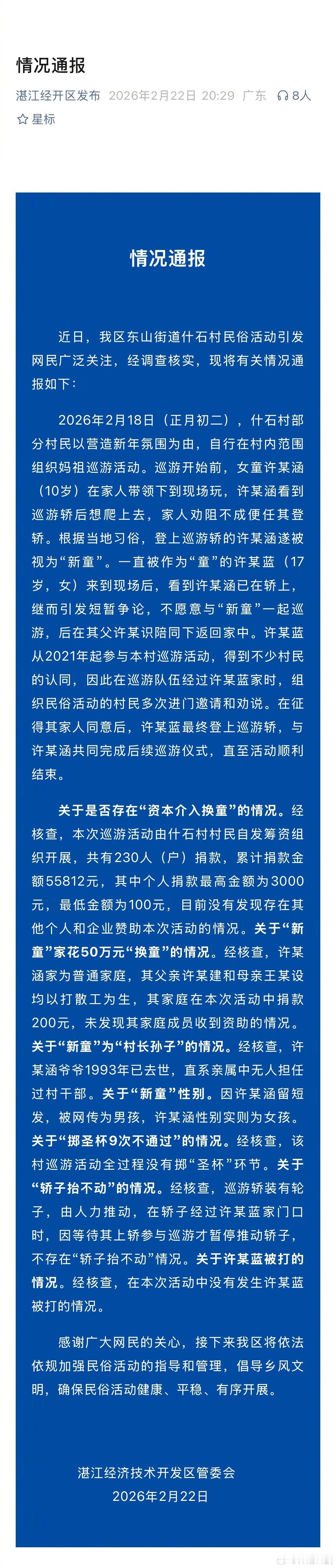 这几天传播很广,闹挺大的,网传妈祖巡游换童事件的官方通报来了。