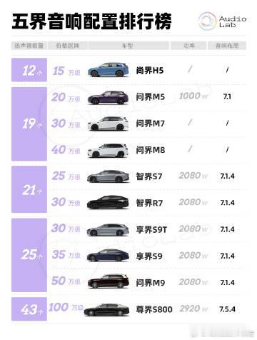 华为音响产品最显化的层级差异,可以通过“五界”中硬件配置和参数来简单辨别。 扬声器数量、功率、以及声道布局等规格,基本按照品牌矩阵中不同的价位以及车型定位进行梯度划分。