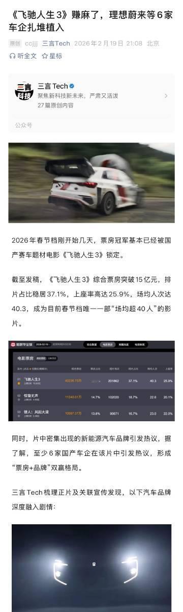 理想蔚来等6家车企扎堆植入《飞驰人生3》