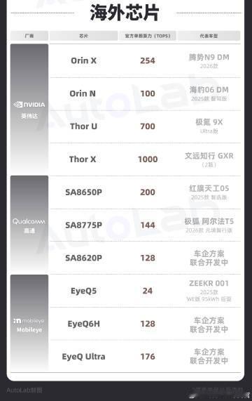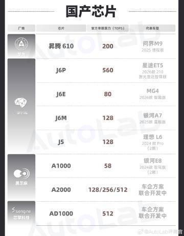 过往那种只有几十TOPS的芯片越来越少,大多数芯片的单颗算力都集中在了100TOPS以上 为了方便大家对市面上的芯片有更多的了解,我们整理了目前比较主流的芯片产品以及对应的算力和代表车型