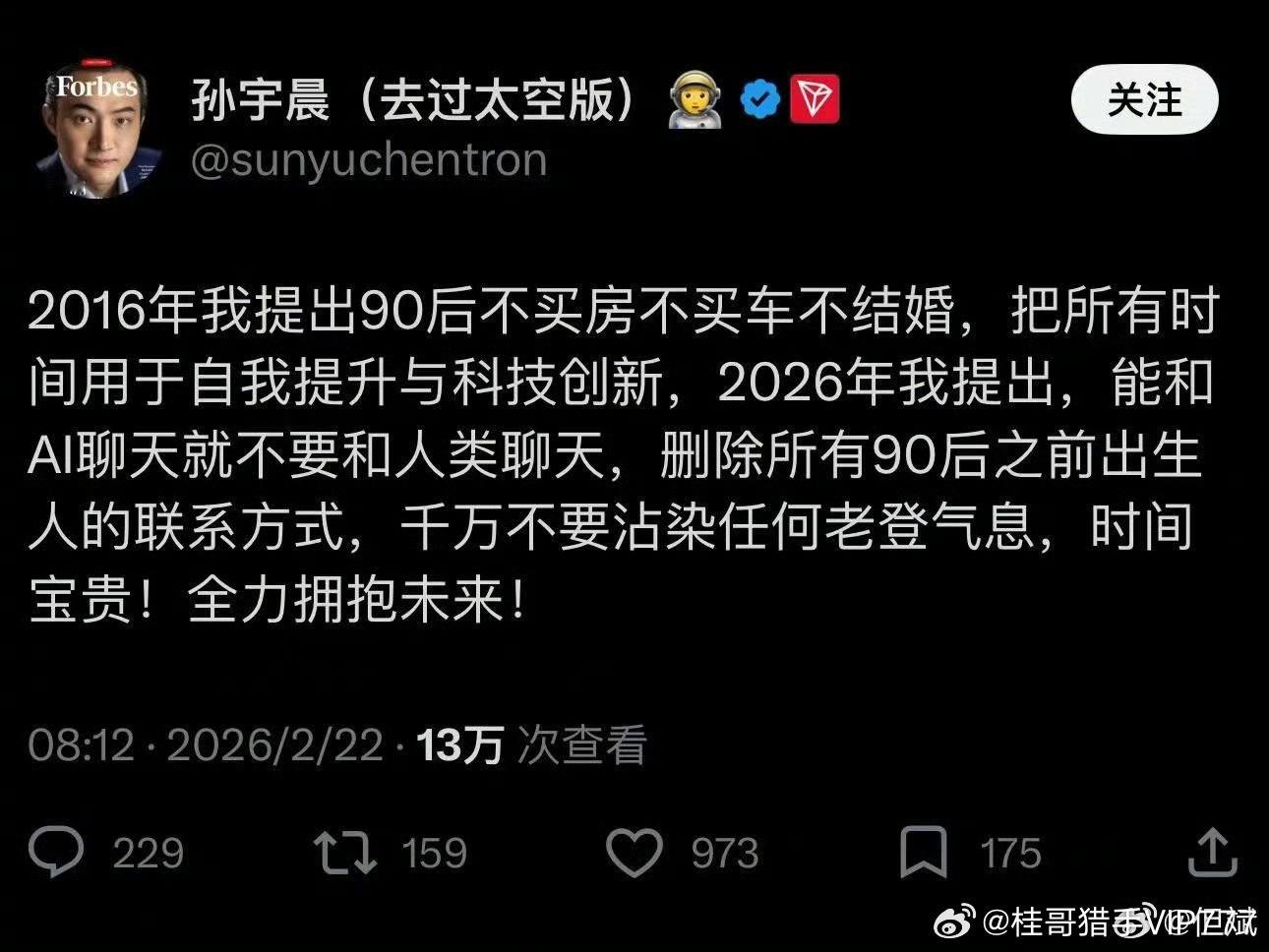 桂哥评:孙割有其前瞻性的深度思考和思维能力。能看透本质,这是其能改命的根本因素。===但斌:从投资视角看,孙宇晨十年观点的演变,恰是时代红利的精准捕捉。