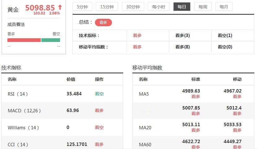 还有几个小时, 新的一个交易周就要开始了。 未来如何运行概率比较大? 简单通过技术指标进行分析。 通过下图,可以明显看出: 技术指标中,有三项是利多的, 只有一项是看空的。 移动平均数中, 八项指标中,全部是看多的。 也就是说, 未来的一周, 金价继续走强的概率比较大!