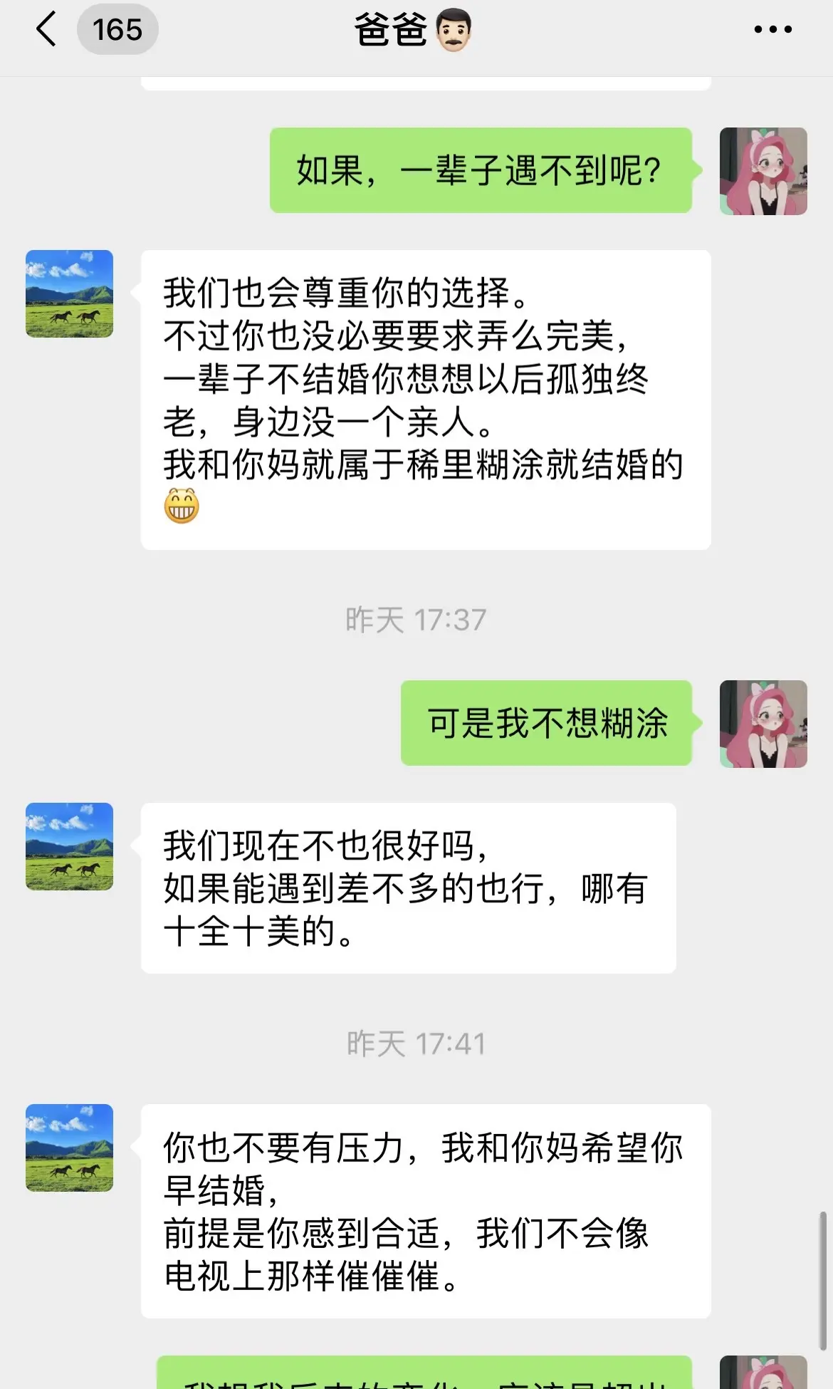 30岁,因为老父亲说的一段话破防大哭,看到朋友们这个年龄家长的着急,所以也很好奇我爸的看法,于是就有了上面的对话