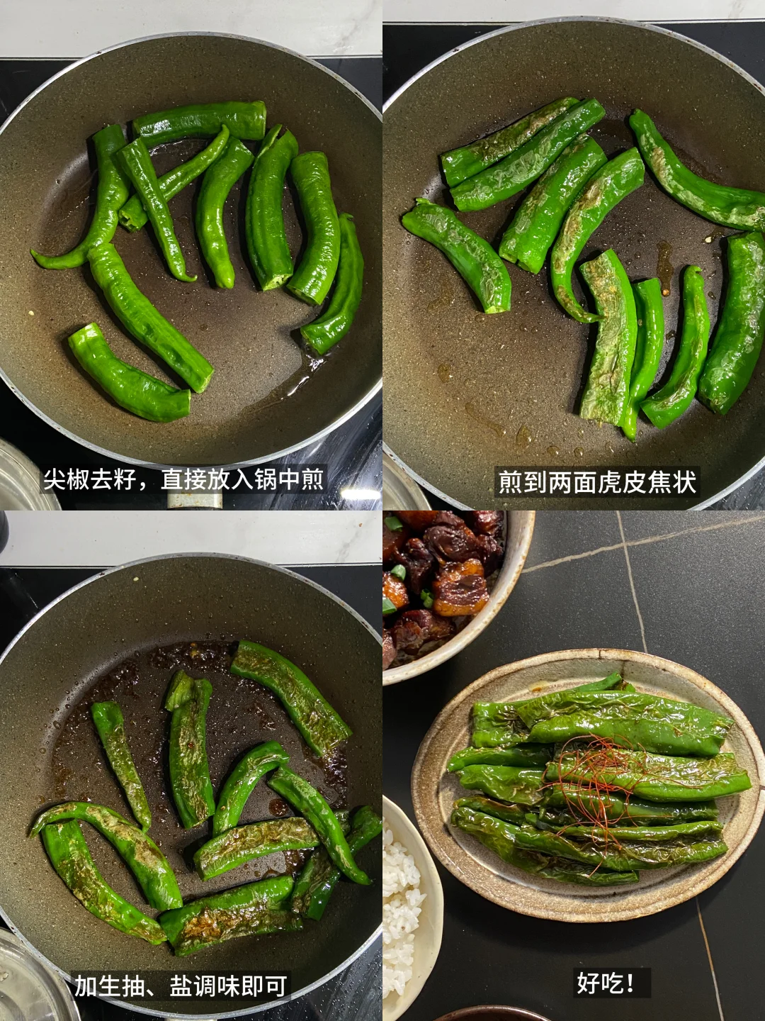 1)尖椒去籽,直接放入锅中煎,煎到两面虎皮焦状,加生抽、盐调味即可