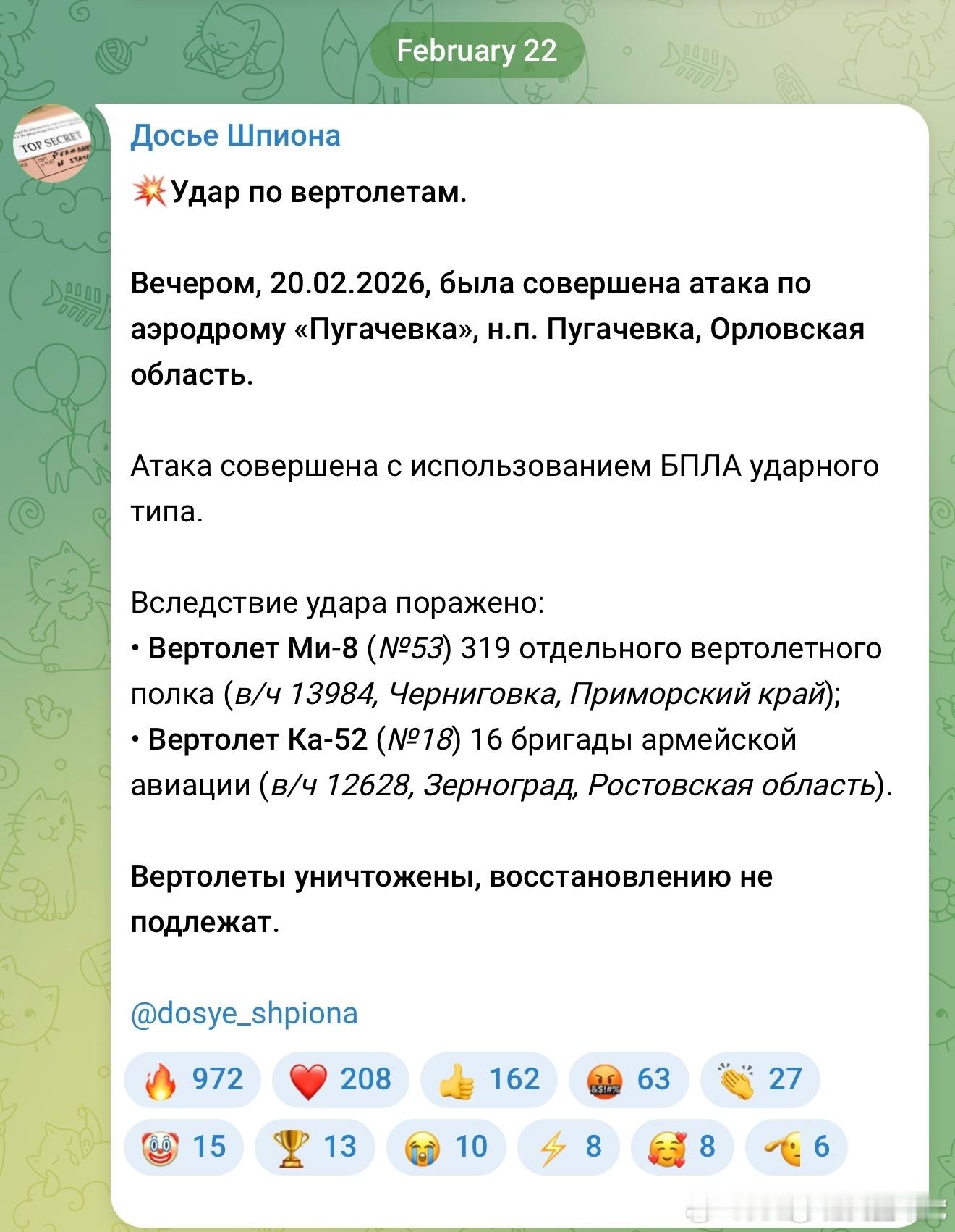 据电报频道“间谍卷宗”,俄境内奥廖尔州的普加乔夫卡机场前天遭到乌军远程无人机袭击,1架Ка-52“短吻鳄”侦察打击直升机(隶属于近卫陆航第16旅)和1架Ми-8多用途直升机(隶属于红旗陆航直升机第319独立团)被摧毁。