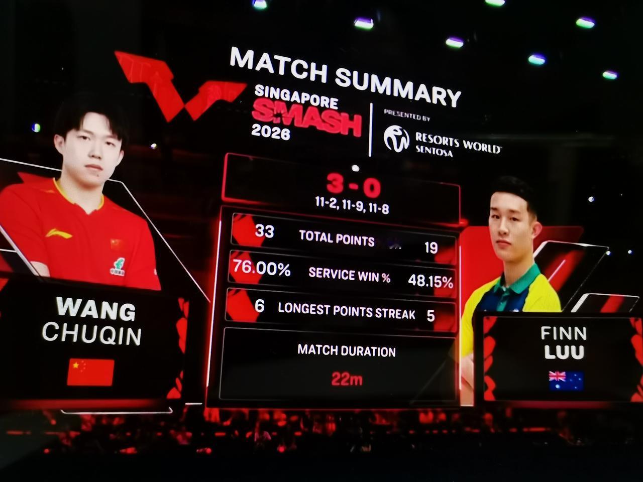 从新加坡大满贯男单首轮,看王楚钦技战术以及面对对手追分的从容。 恭喜王楚钦顺利晋级男单32强,在王楚钦对阵澳大利亚选手卢伟的这一场比赛中,第一局就是看王楚钦一个人独自表演一样,6:1的开局,11:2王楚钦顺利拿下第一局。 第二局同样是王楚钦5:1领先开局,但是第一局被王楚钦打懵了的卢伟,没有被第一局失利影响到第二局的发挥,卢伟从1:5追分到6:6,王楚钦则表现得从容淡定11:9王楚钦有惊无险拿下第二局。 第三局王楚钦7:2领先开局,第三局的后半局,王楚钦再次遭遇了卢伟的追分,11:8王楚钦在局末的关键分处理上,没有给卢伟太多的余地。 2026年新加坡大满贯首轮王楚钦以11:2、11:9、11:8顺利拿下,晋级男单32强,王楚钦每一局的开局都非常稳定,虽然第二局和第三局都有被追分,但是局末关键分的处理非常干净利落,也体现了王楚钦的实力非常稳定。