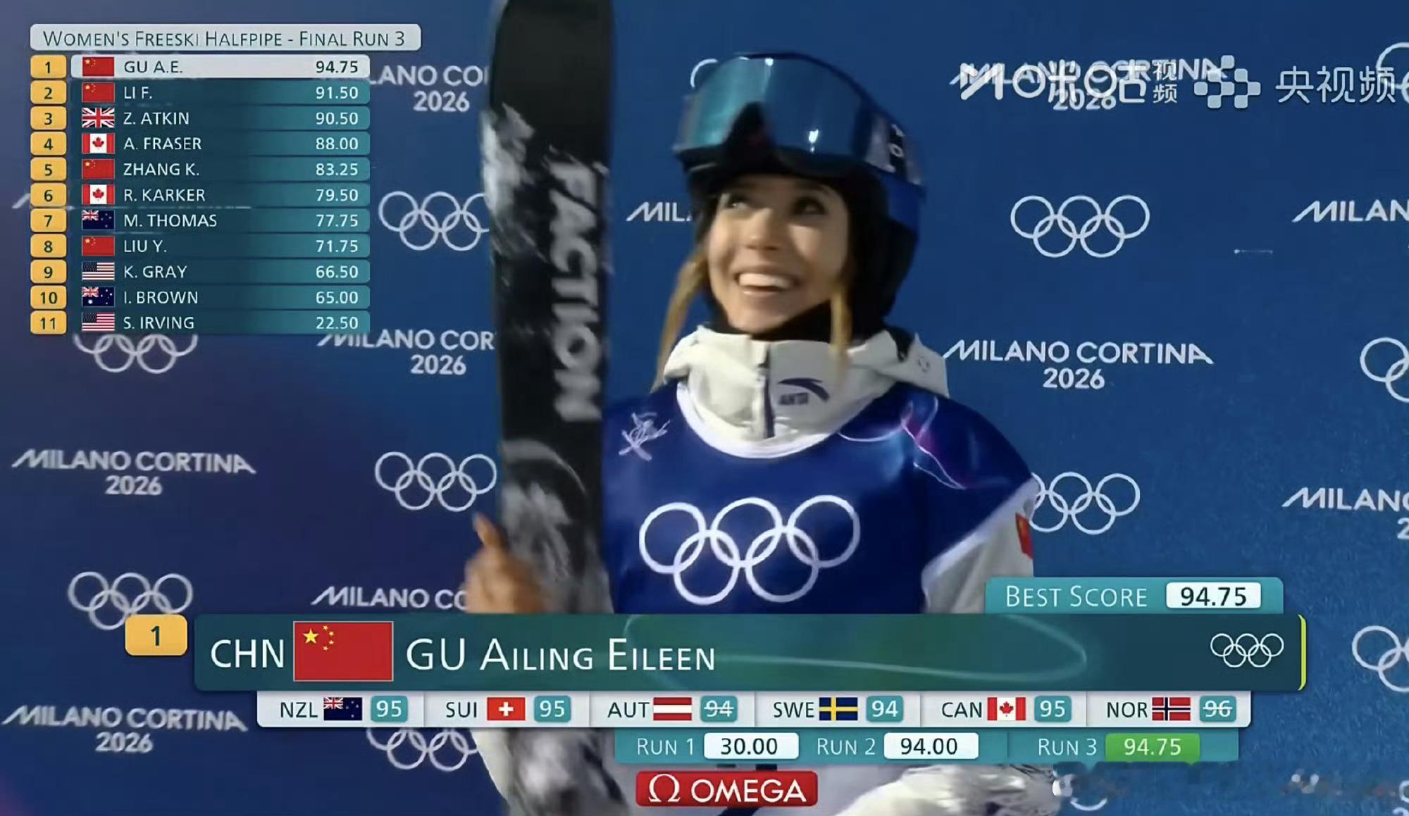第五金!!!中国队包揽金银牌!!!谷爱凌金牌谷爱凌第三滑94.75分中国队米兰第