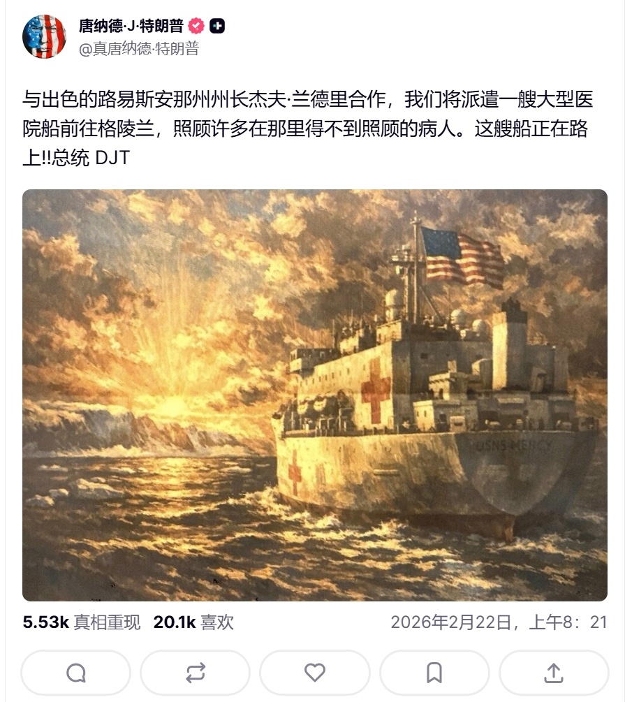 特朗普发文表示将派遣一艘大型医院船前往格陵兰岛,为格陵兰岛众多得不到妥善治疗的病人提供医疗服务,并表示该船正在前往格陵兰岛的途中。
