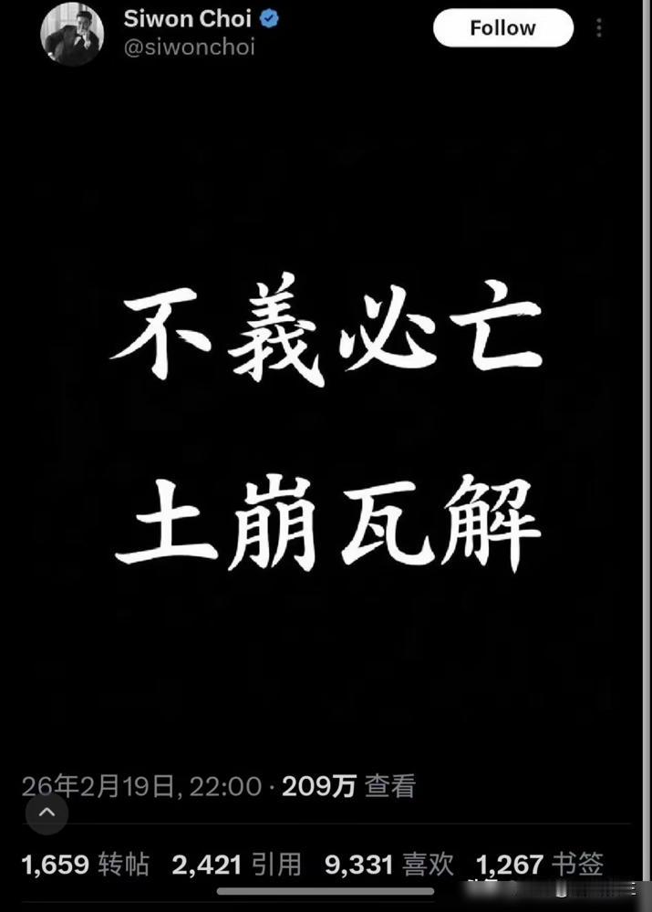8个汉字,SM公司直接发律师函。 韩国顶流崔始源,甩出八个大字:“不义必亡,土崩瓦解”。 时间点卡得死死的,前脚韩国前总统刚被判无期,他后脚就发了这么一句。 结果呢?韩国网友自己都懵了,还得打开翻译软件才能看懂祖宗传下来的字。 最有意思的是什么?公司不解释,不澄清,直接把枪口对准了评论区的网友。 你以为这是在保护艺人?别天真了,他们是在保护商品。 他们怕的不是你看不懂,他们怕的是你看得太懂。