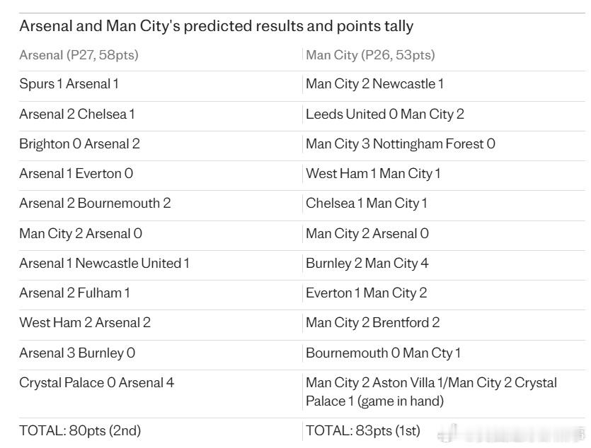 电讯报预测英超争冠结局:阿森纳80分亚军,曼城83分逆转夺冠。