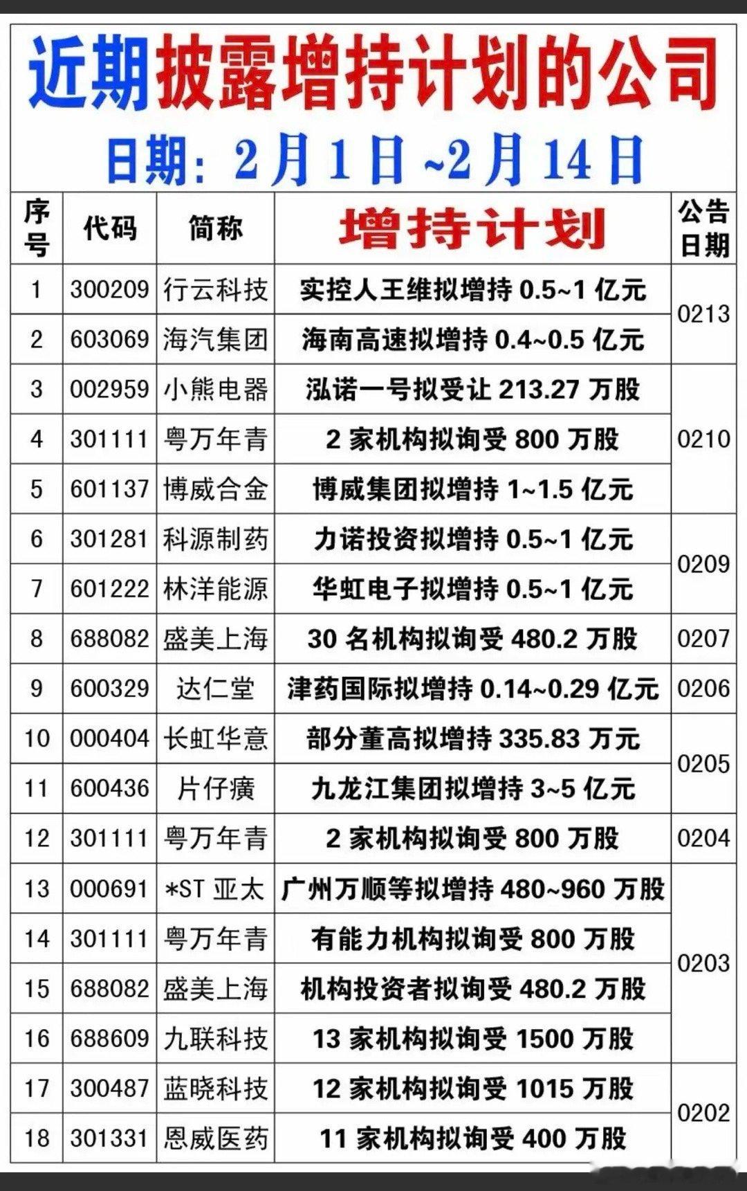 2.22周日 近期披露 增持计划的公司!