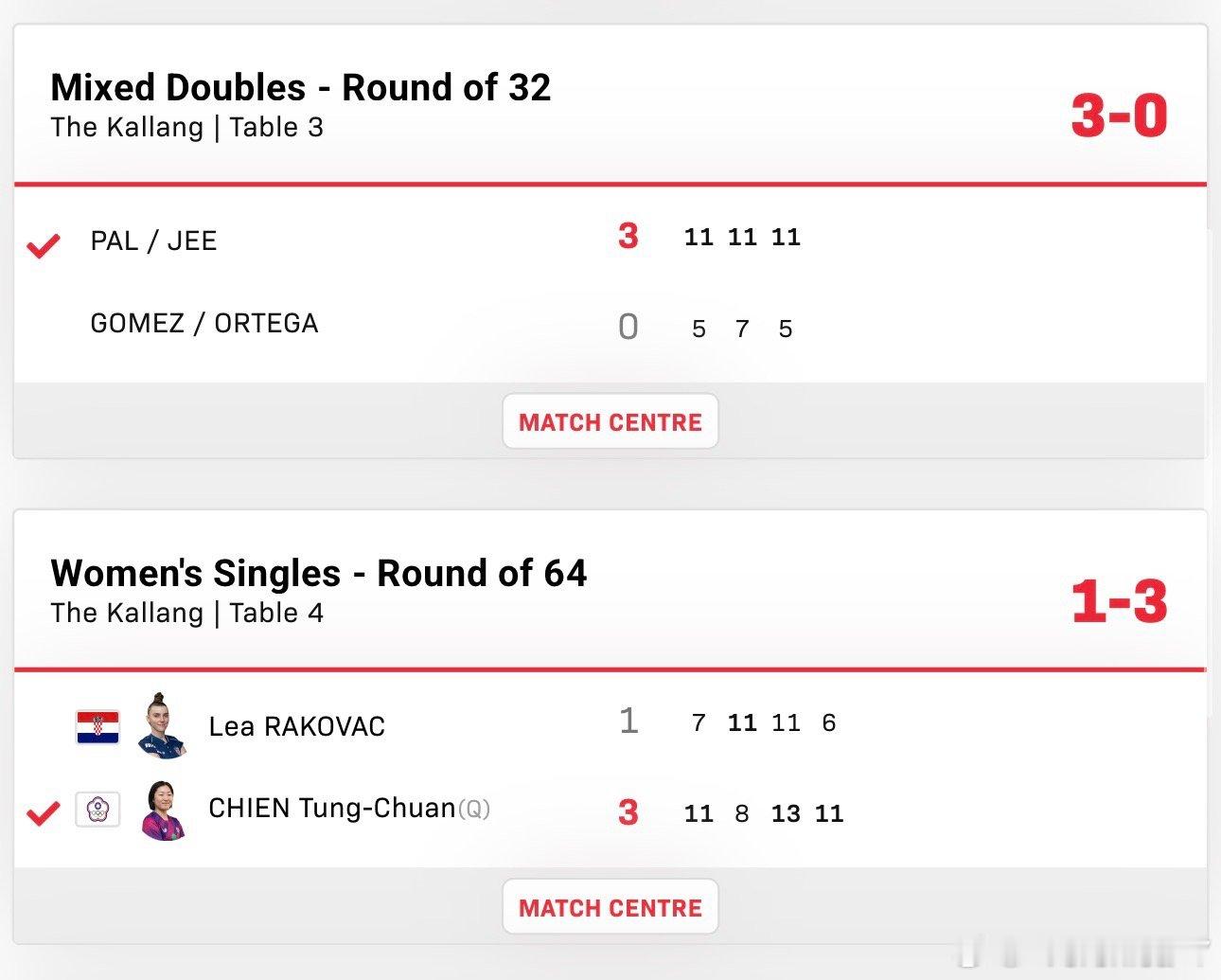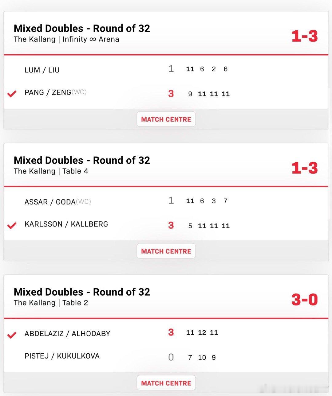 2026新加坡大满贯混合双打32-16林文政/刘杨子1-3冯耀恩/曾尖尤瑟夫/玛利亚姆3-0皮斯特耶/库库洛娃阿喀什/池旼智3-0戈麦斯/丹妮拉奥马尔/高达1-3 K·卡尔松/克里斯蒂娜