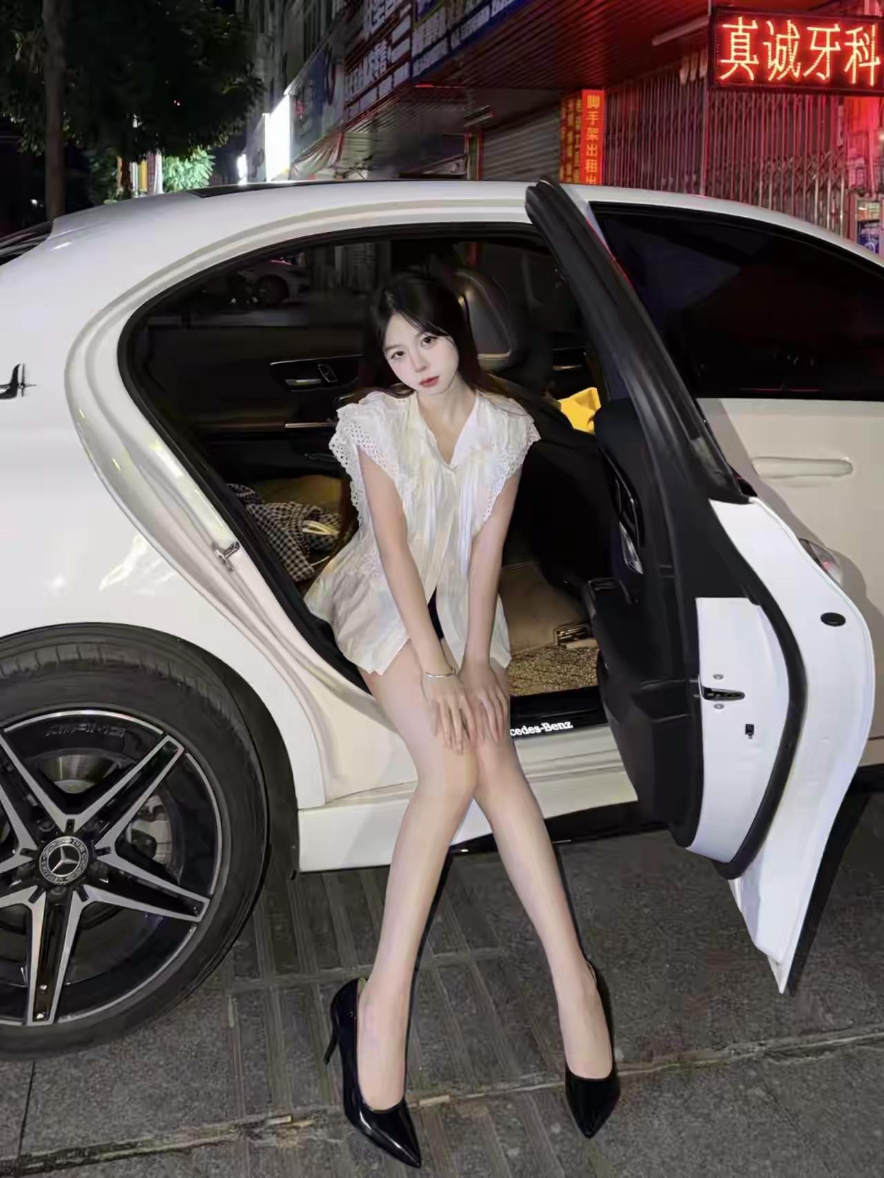 优雅车模,白色连衣裙,坐在驾驶座上,微笑迷人!😊🚗💃今天,明天,后天,哪一