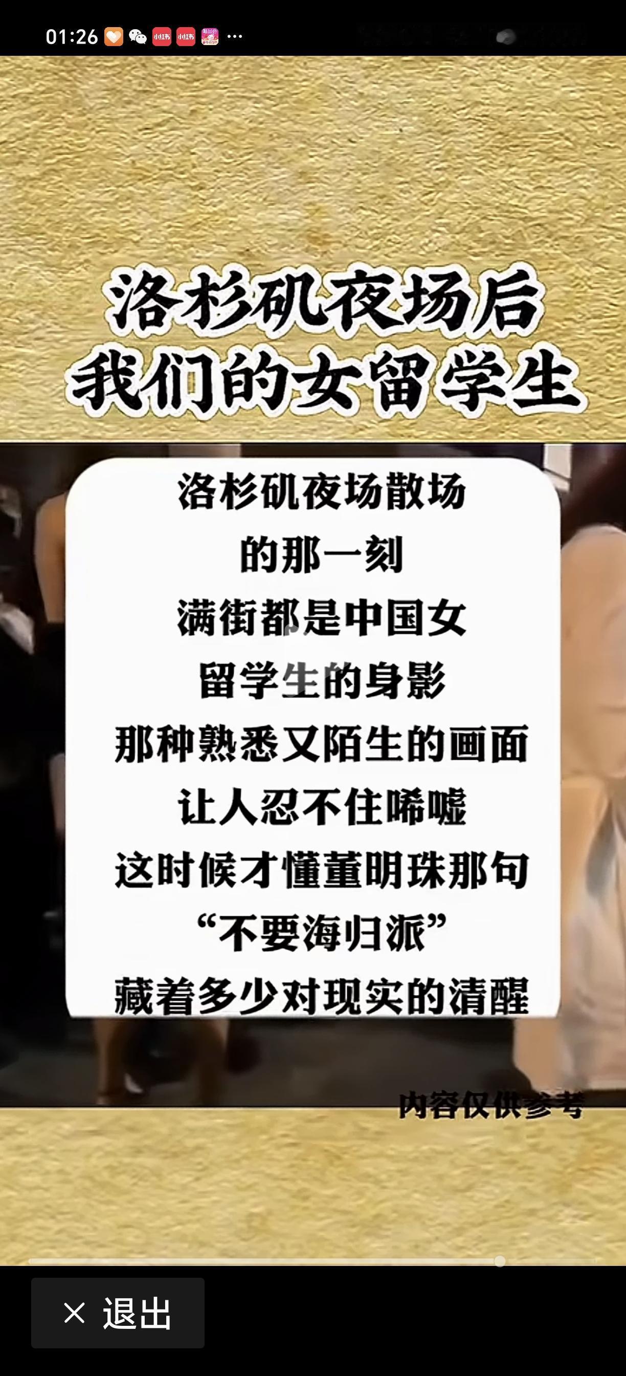 牢A说的女留子得到了证实。 牢A说的女留子,是存在的,但也不是说全部女留学生都是女留子。 刚刷到一个视频,视频显示:洛杉矶夜场散场的那一刻,满街都是中国女 留学生的身影,说明什么?只能说明部分女留学生:不是一心只读圣贤书,两耳不闻窗外事那种,刻苦留学而枯燥乏味的生活,而是有丰富多彩的夜生活。 牢A说的话得到证实。