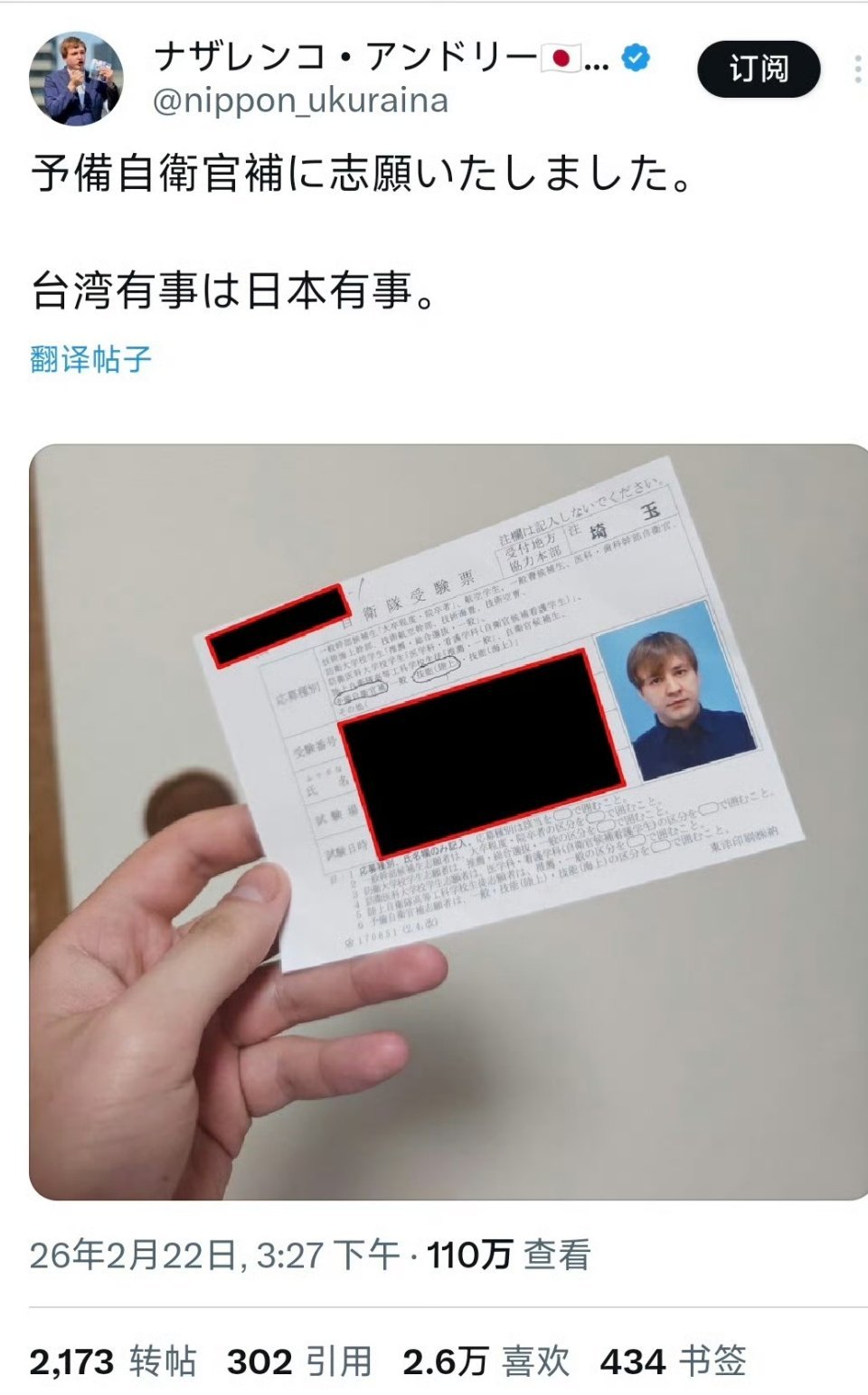 -一在日本生活的乌克兰男子发帖宣称自己“志愿报考了预备自卫官补”,并附上了一张自卫队受验票的照片。