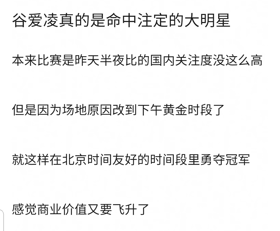 我一直没懂一些网友为什么对谷爱凌拿金牌这么恨,明明两届冬奥会拿下含金量巨高的金牌,商业价值高也是应得的