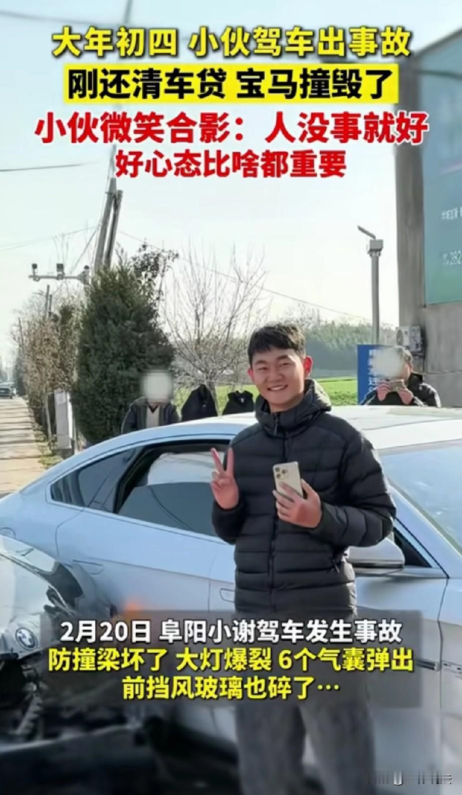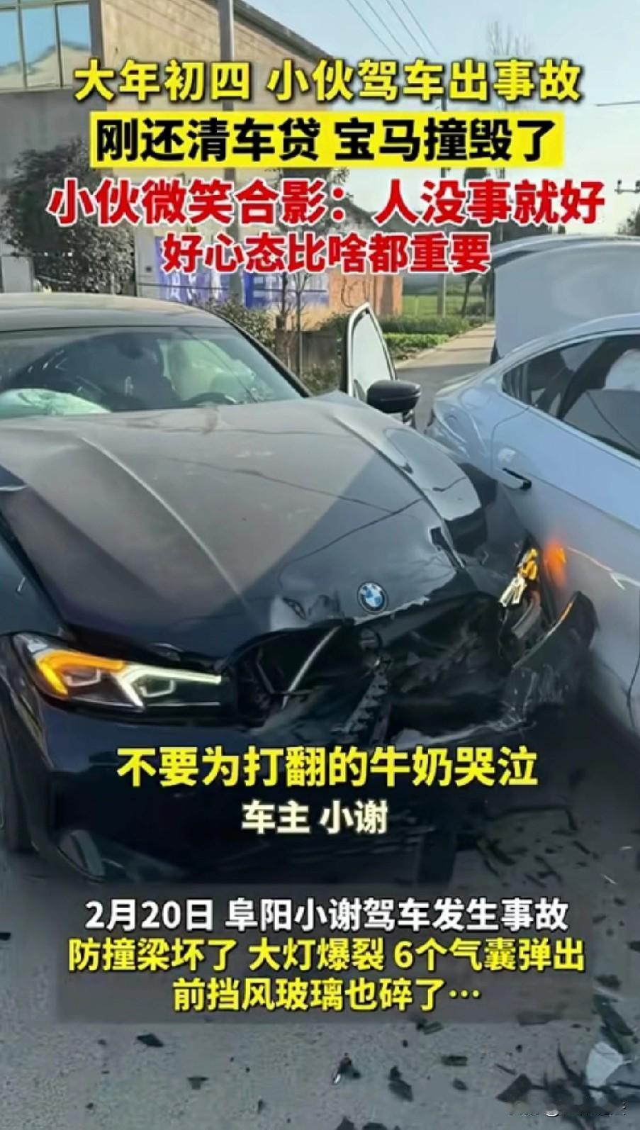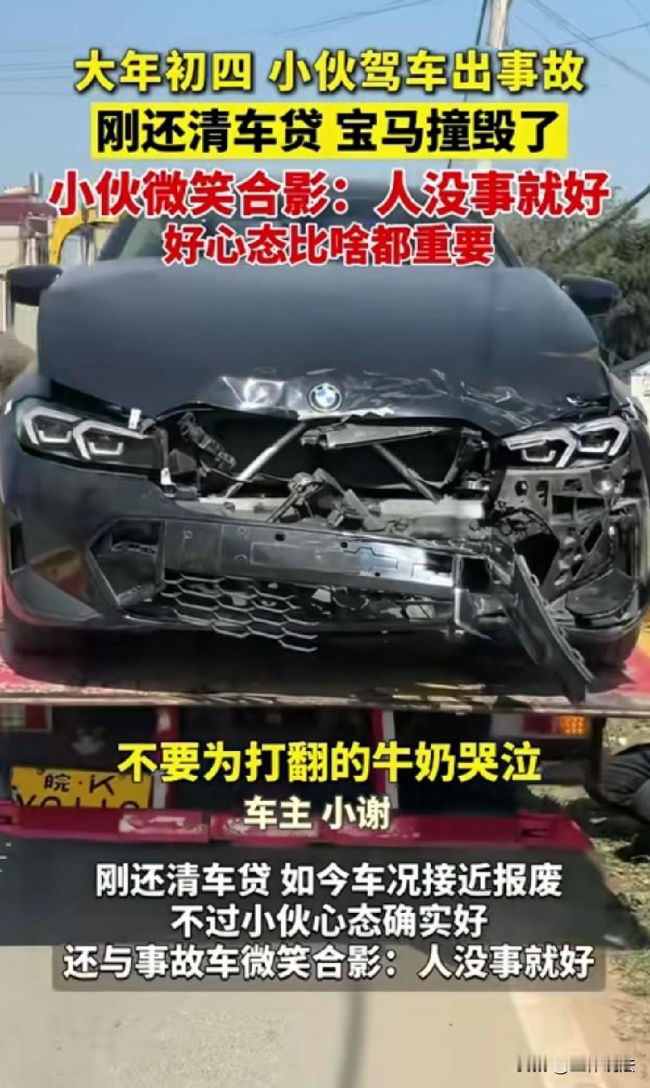安徽阜阳,小伙驾车回家,不慎发生事故,导致防撞梁撞坏、气囊也全部弹出,车辆几乎报废。小伙刚把车贷还完,就出现这样的大事故,换作一般人肯定伤心的不得了,但他心态很好,微笑着和事故车合影拍照,表示:人没事就好,不要为打翻的牛奶哭泣。 大年初四,正是大家走亲访友、开开心心过年的时候,小伙小谢也驾车准备回老家。 可万万没想到,原本平常的一趟回家路,却发生了意外交通事故。 当时小谢正常行驶在路上,不知道是路况问题还是操作上的一点疏忽,车子突然失控撞上了障碍物,巨大的冲击力让车辆瞬间受损严重。 等小谢缓过神来一看,眼前的景象让他心里咯噔一下,也算是不幸中的万幸。 他开的宝马车车头已经面目全非,防撞梁直接撞坏,大灯彻底爆裂,前挡风玻璃碎得一塌糊涂,车内六个安全气囊更是全部弹了出来,整辆车已经接近报废状态。 看到车子变成这样,换做任何人心里都会又心疼又难受,更何况这辆车对小谢来说意义特殊。 这辆宝马是小谢辛辛苦苦打拼,一点点还车贷才拥有的,就在事故发生前不久,他才刚刚把最后一笔车贷还清。 本想着无债一身轻,以后能开开心心开着自己的车出行、过年,好好享受生活,结果刚还清贷款没几天,就遇上了这么严重的事故,车子直接撞成了废车,这份打击实在不小。 小谢站在自己撞坏的车旁边,心里其实也难免有些惋惜,毕竟是自己刚还完贷的爱车,付出了那么多时间和金钱,转眼就毁于一旦,说不心疼是假的。 但他很快就冷静了下来,第一时间检查自己的身体,发现除了受到一点惊吓,身上没有任何受伤的地方,这让他瞬间松了一口气。 在小谢心里,车子再贵、再新,也比不上人的安全重要。 钱没了可以再挣,车坏了可以再换,可要是人出事了,那才是真的追悔莫及。 想到这里,小谢心里的郁闷和惋惜一下子就消散了,反而觉得格外庆幸。 他没有唉声叹气,也没有怨天尤人,反而调整好表情,笑着走到事故车旁边,拿出手机和这辆撞坏的宝马合了一张影。 面对前来了解情况的人,小谢也看得很开,他觉得事情已经发生了,再难过、再后悔也没用,就像老话讲的,不要为打翻的牛奶哭泣。 车子没了就没了,只要人平平安安的,比什么都重要,过年过节的,平安才是最大的福气。 小谢这番话和他乐观的心态,让身边的人都忍不住点赞。 一场突如其来的车祸,毁了他刚还清车贷的爱车,却没有击垮他的心态。 在很多人纠结财产损失、为物质东西伤心难过的时候,小谢却看透了最本质的道理:世间万物,都比不上生命和平安珍贵。 这场意外虽然让小谢损失了一辆爱车,却也让大家看到了一个普通人最难得的生活态度。 不纠结于已经失去的,珍惜当下拥有的平安健康,这份好心态,远比一辆宝马车更加珍贵。 也正是这份通透,让小谢在遭遇不幸时,依然能笑着面对,这才是生活里最该有的样子。 《民法典》第一千二百零八条规定:机动车发生交通事故造成损害的,依照道路交通安全法律和本法的有关规定承担赔偿责任。 本案属于典型的单方交通事故,小谢因操作不慎导致车辆严重受损、自身未受伤且未伤及第三方。 事故由小谢单方过错引发,无其他侵权方,车辆损失按保险与合同处理。 投保机动车损失险的,由保险公司在保额内按定损理赔,含维修、施救或全损赔付;未投保车损险的,车辆损失由小谢自行承担。 至于小谢已还清车贷,车辆所有权完整,无需因车贷向金融机构承担额外违约或赔偿责任。 小谢关于“人没事就好”的表态,并不影响保险理赔与责任认定,属于合法处置自身民事权益。