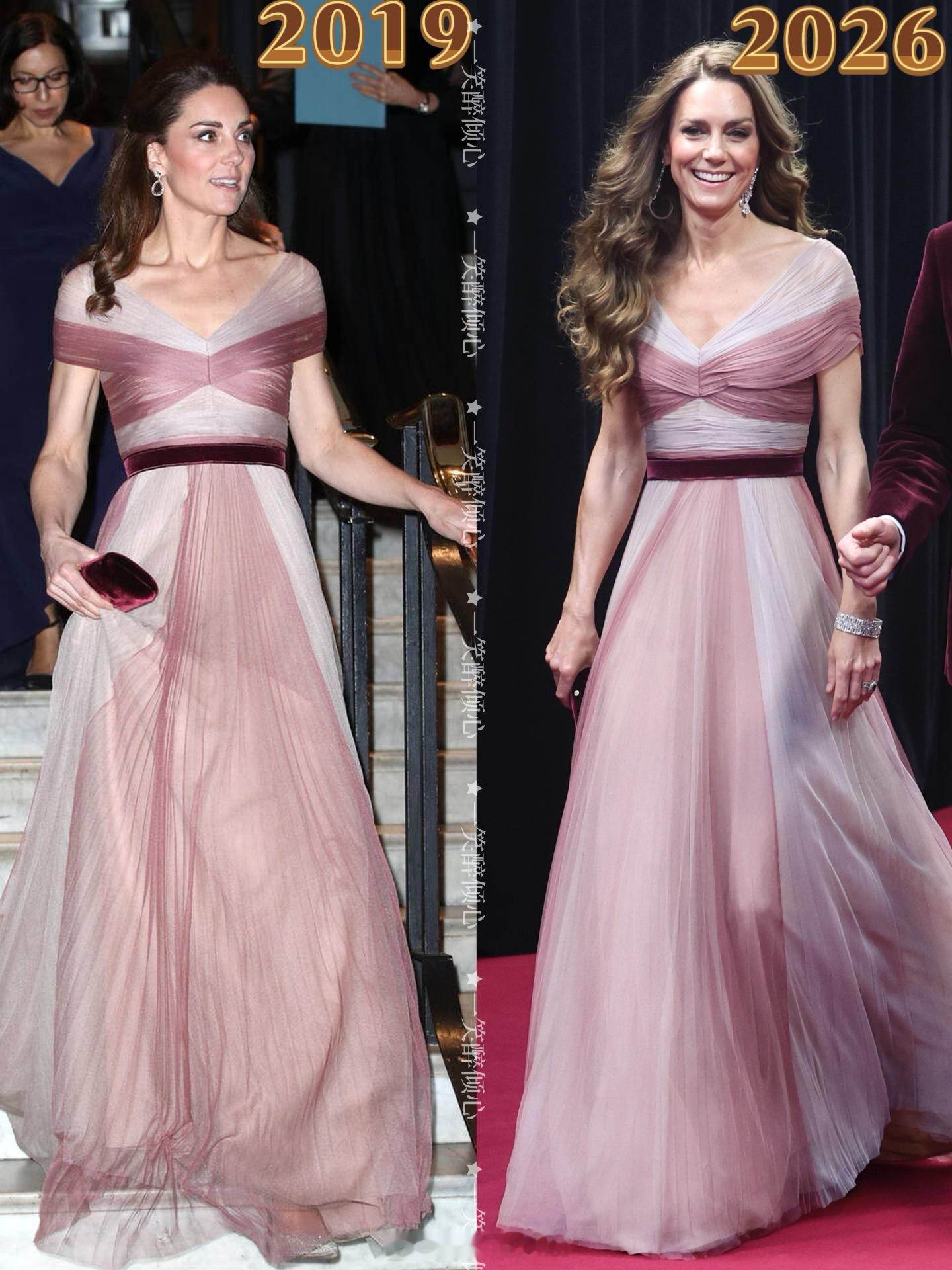 2019➡️2026【旧衣重穿】凯瑟琳王储妃重穿了2019年穿过的Gucci粉白晚礼服👗2019年2月13日,剑桥公爵夫人凯瑟琳在伦敦维多利亚和阿尔伯特博物馆参加百位金融女性晚宴,为心理健康学校筹集资金;2026年2月22日,威尔士亲王夫妇在伦敦皇家节日音乐厅参加一年一度英国电影学院奖颁奖典礼。