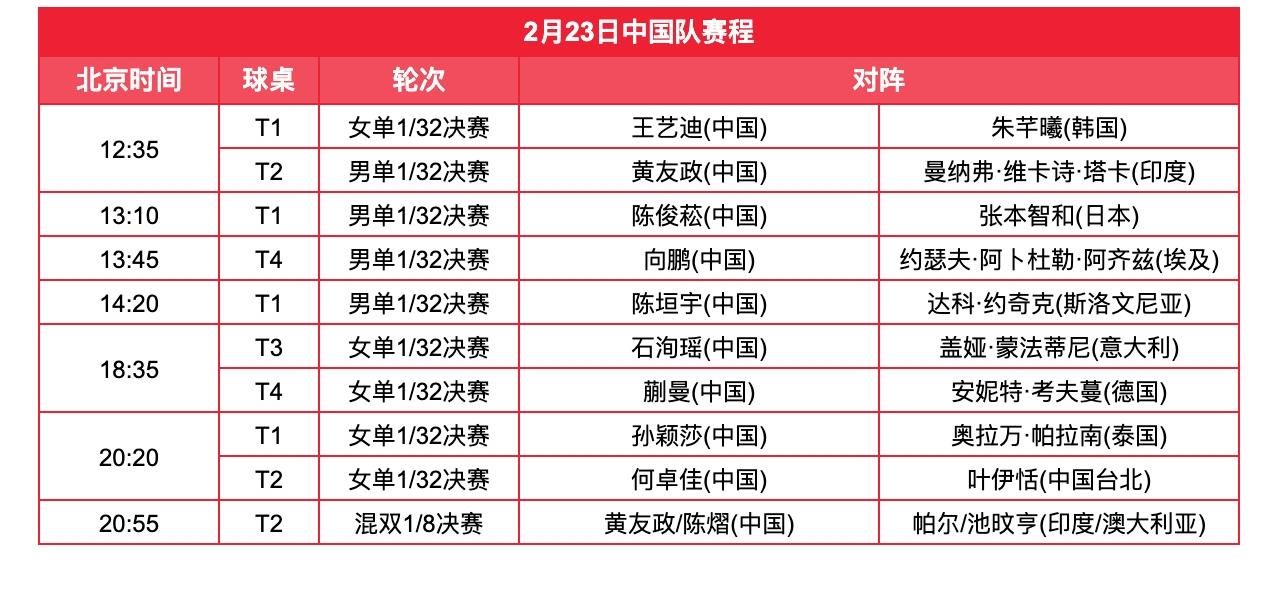 新加坡开赛第二天! 场场硬仗,陈俊崧🇨🇳再次挑战张本智和🇯🇵!孙颖莎迎战怪球手帕拉南🇹🇭! 2026WTT新加坡大满贯2月23日(初七,周一)全日赛程如图所示。 蒯曼也迎来了自己的新加坡首秀,晚上六点多迎战德国新秀考夫曼🇩🇪! (感谢草莓老师的图片)