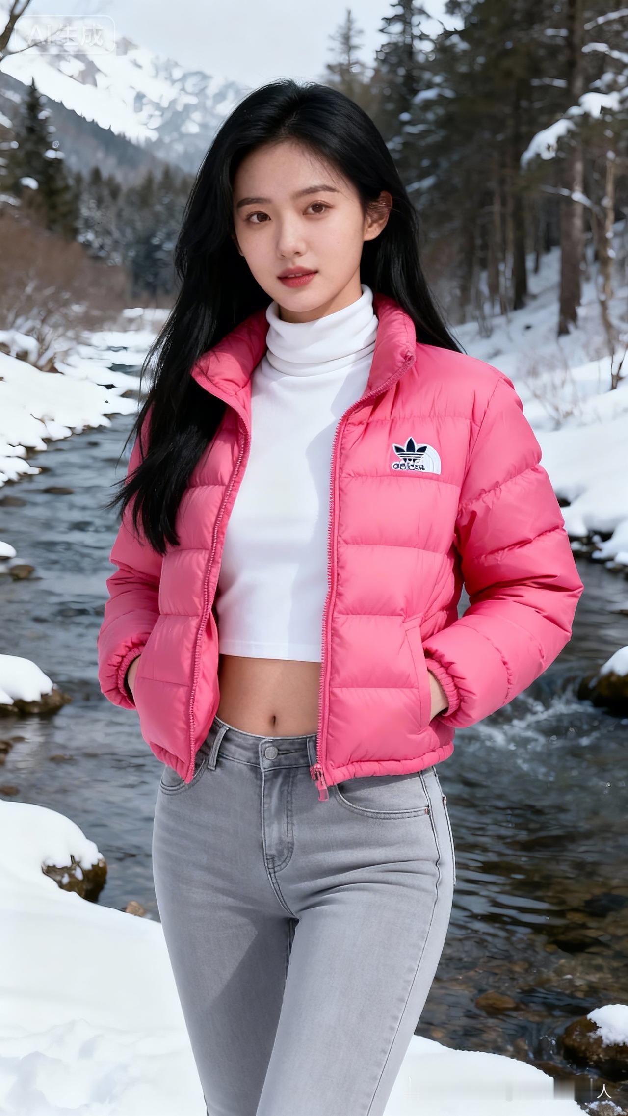 冬日雪景中的时尚穿搭,粉色羽绒服搭配白色高领衫和灰色牛仔裤,温暖又时尚!🌨️👗👖