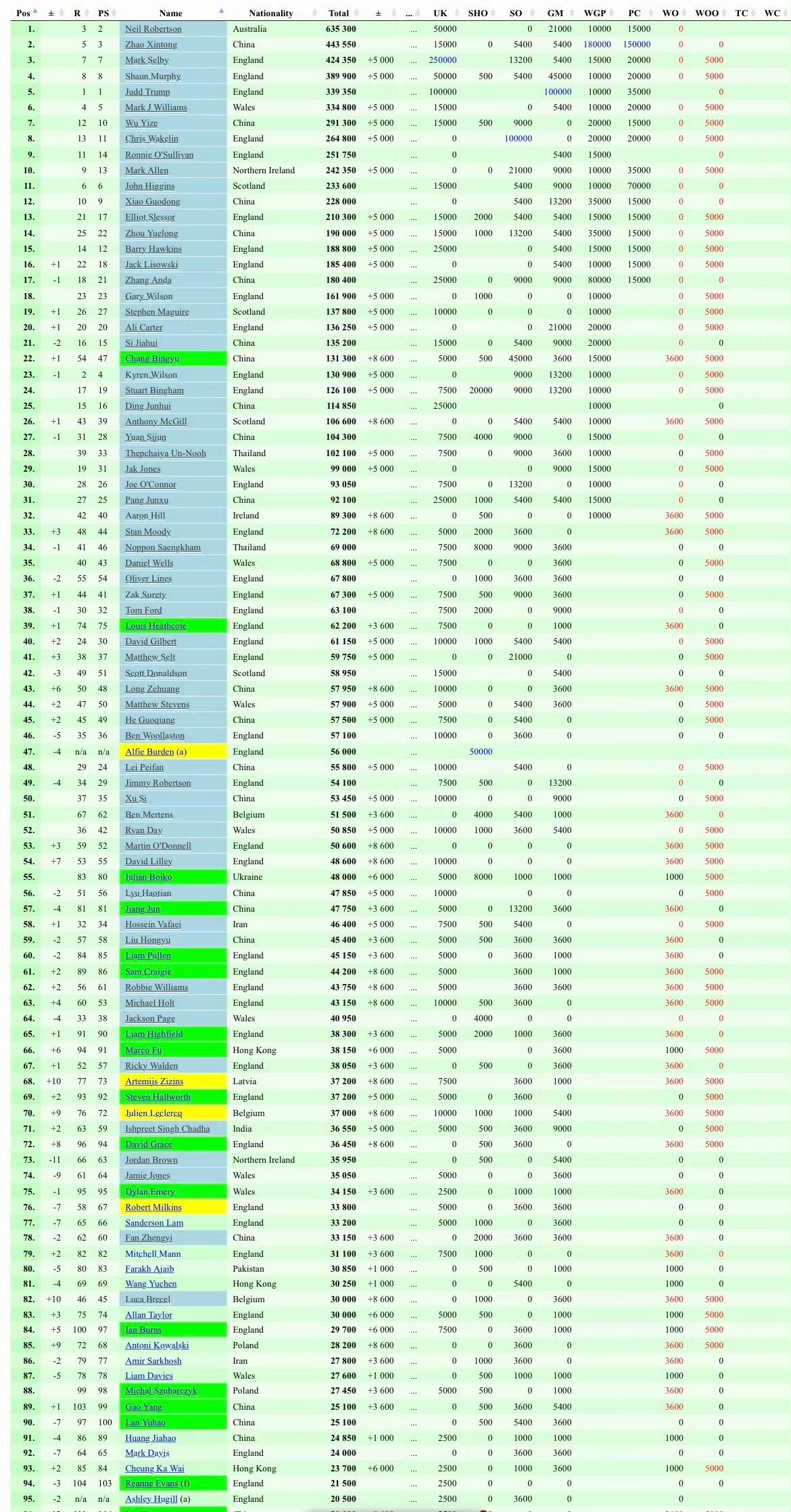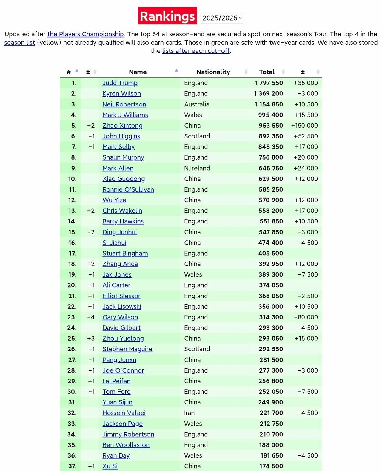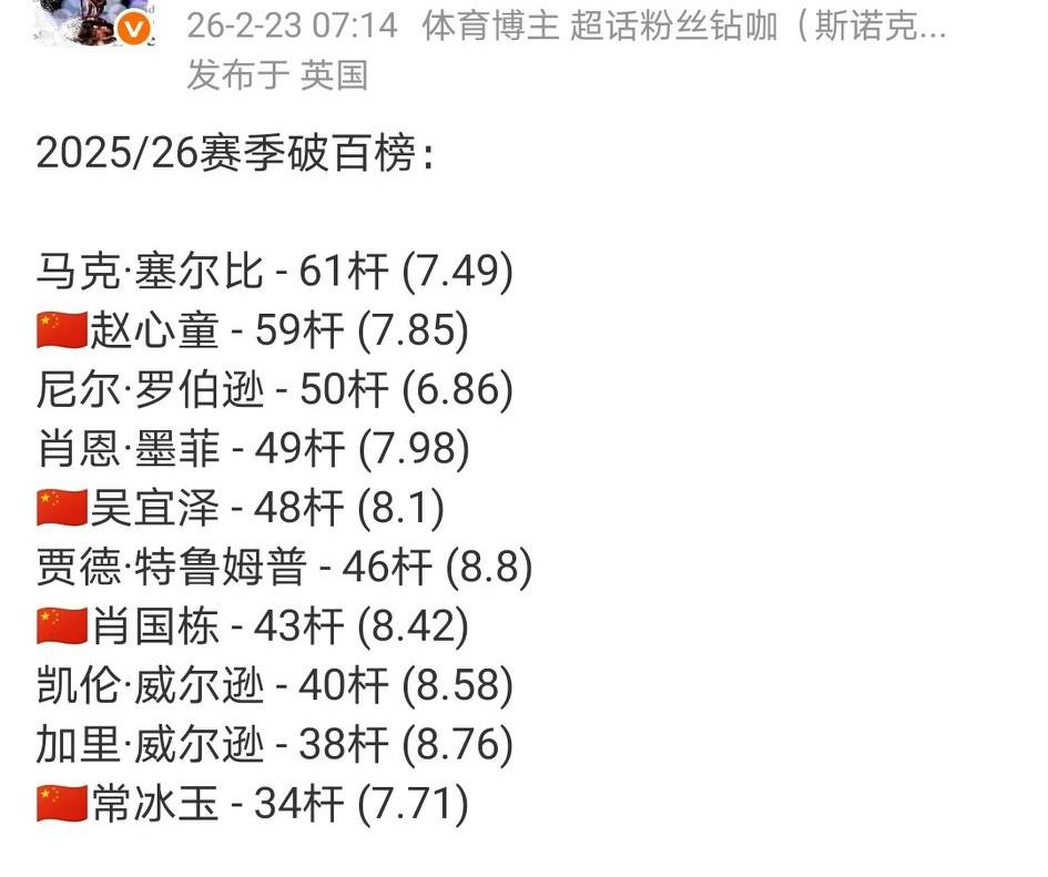 随着赵心童夺得球员锦标赛冠军,最新世界排名和单赛季排名也已出炉。本赛季破百榜单同步更新。 图1:赵心童升至世界第5,丁俊晖跌至第15,斯佳辉成为直通克鲁斯堡守门员,比第17名的宾汉姆多了将近7万英镑,还是挺稳的。 图2:赵心童升至第2,吴宜泽第7,肖国栋刚好排名第12,比第13的斯莱塞仅仅多了17700英镑,很危险。能否晋级巡回锦标赛,肖主播打后面的比赛还得多努力。 图3:塞尔比61杆稳居榜首,赵心童59杆稳居第二。单赛季要破100杆,难度有点大。