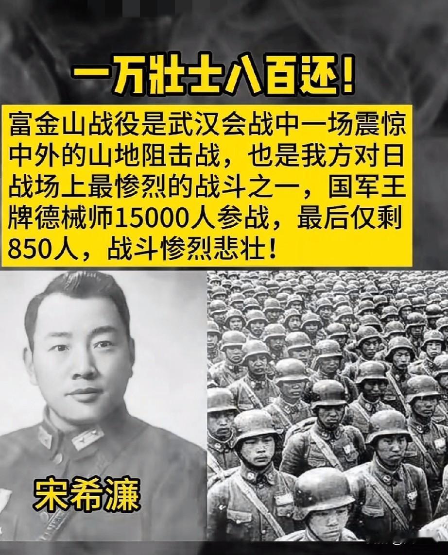 他们都是民族英雄! 在武汉会战的富金山战役中,宋希濂将军率领的德械师15000名壮士,在山地阻击战中浴血奋战。面对数倍于己的日寇,他们死守阵地,最终仅850人幸存,上演了“一万壮士八百还”的悲壮史诗。 他们用血肉之躯筑起了一道坚不可摧的防线,用生命诠释了中华儿女宁死不屈的民族气节。山河记得,人民记得。 请停留三秒,向富金山战役中牺牲的英烈们致敬,铭记那段用热血与生命铸就的历史。