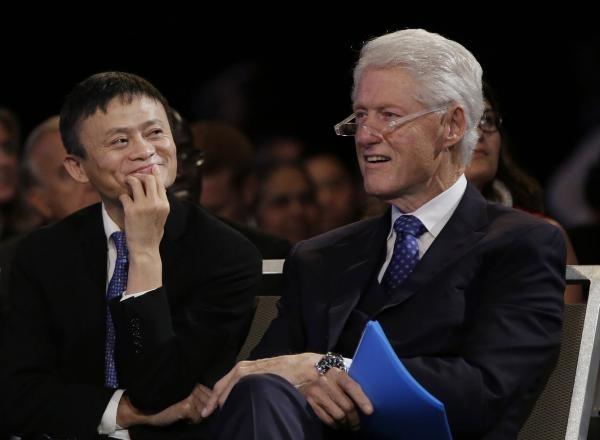 克林顿:我就戴戴眼镜。 马云:我就瞧瞧,毕竟太少看到克林顿戴眼镜了。