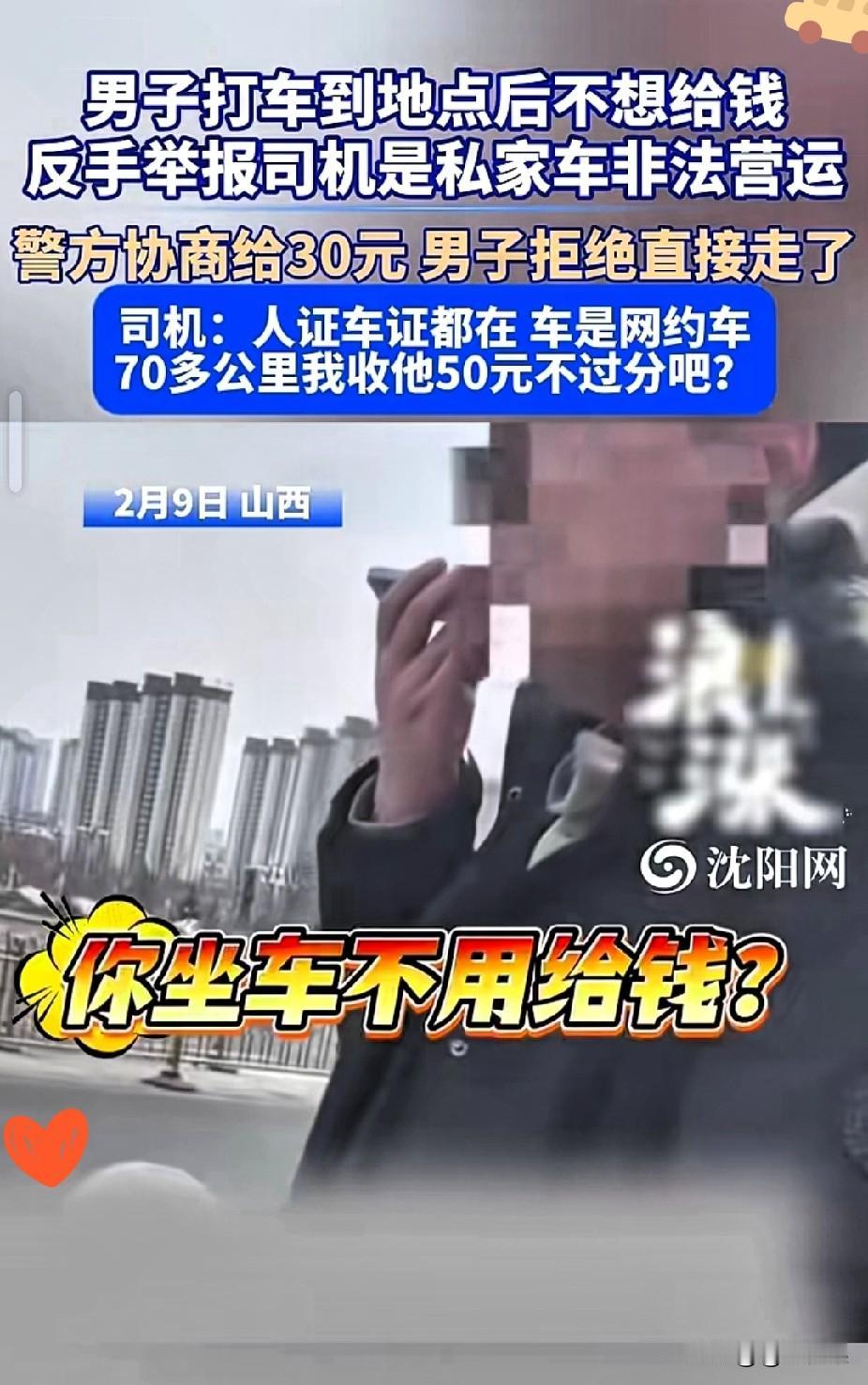 真够离谱!坐车不给钱还倒打一耙,这男的简直是把无赖玩到了极致! 跑70多公里路,司机只收50块钱,连成本都快兜不住,明明是良心价,到目的地却被乘客赖账,还被反手举报非法营运。好在司机人证、车证一应俱全,完全合规合法,警方调解降到30元,男子依旧一分不掏直接走人。 占了便宜还想栽赃陷害,这种行为既丢人品又破底线。司机风里来雨里去挣的都是辛苦钱,每一分都该被尊重,恶意赖账、恶意举报绝不能纵容。做人最基本的就是守规矩、讲良心,贪小便宜耍心机,迟早要为自己的行为买单。 我觉得这种恶意赖账的行为,必须严肃处理?