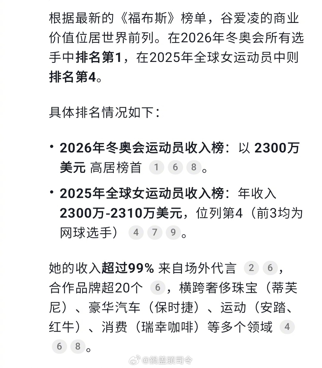 #谷爱凌炸完赛场炸秀场#根据最新的《福布斯》榜单,谷爱凌的商业价值位居世界前列。在2026年冬奥会所有选手中排名第1,在2025年全球女运动员中则排名第4。今年又拿了金牌,估计商业价值会进一步提高!