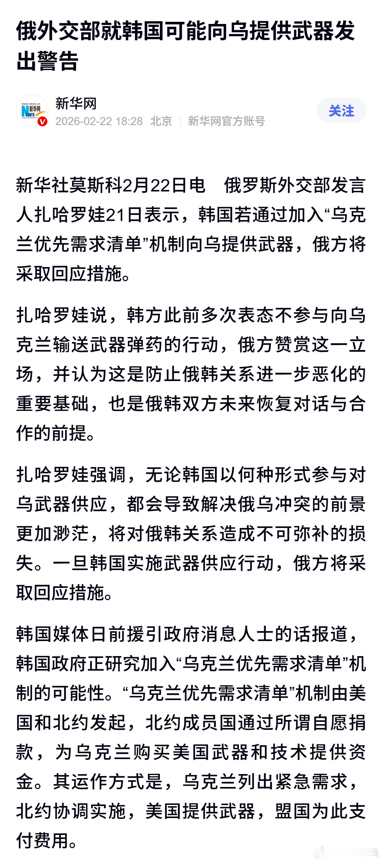 俄外交部就韩国可能向乌提供武器发出警告