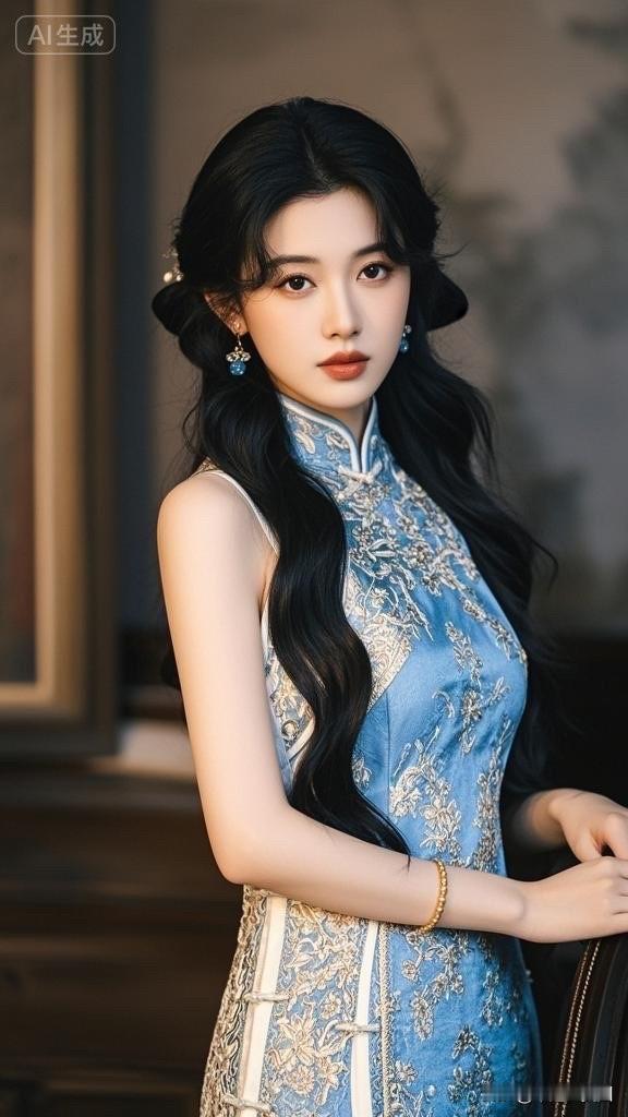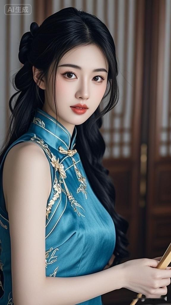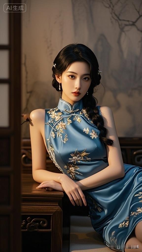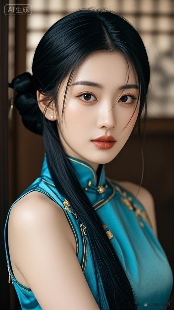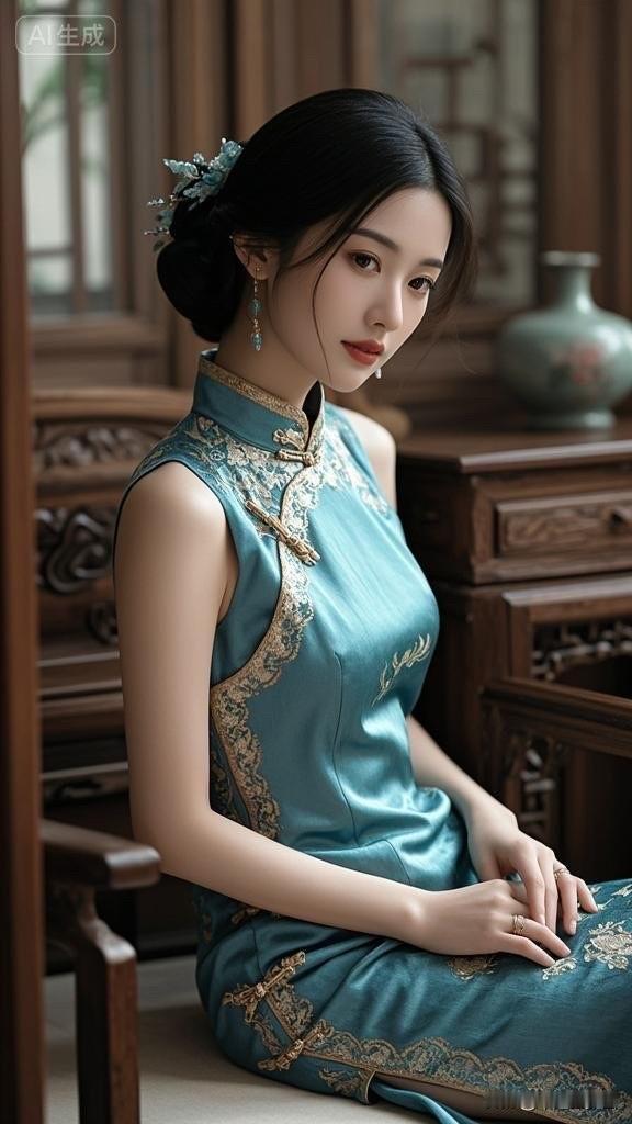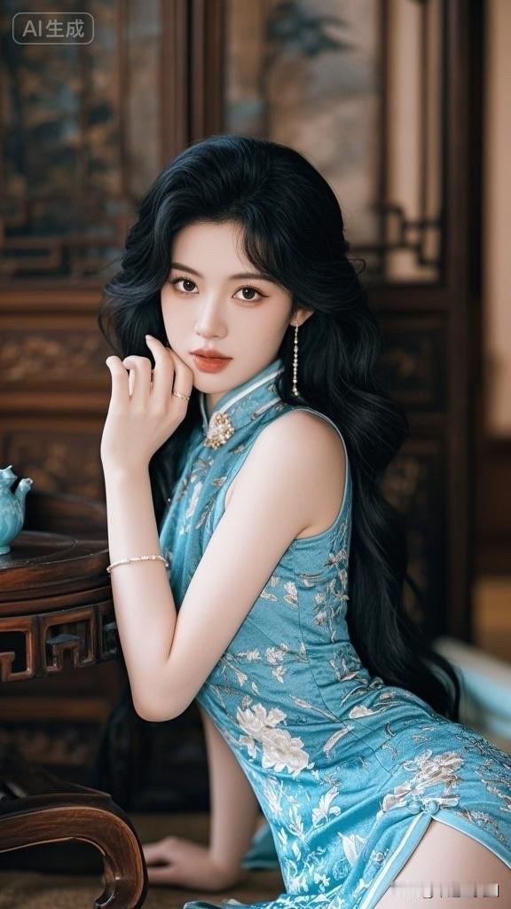 冷艳黑发美人,古典旗袍,韵味十足