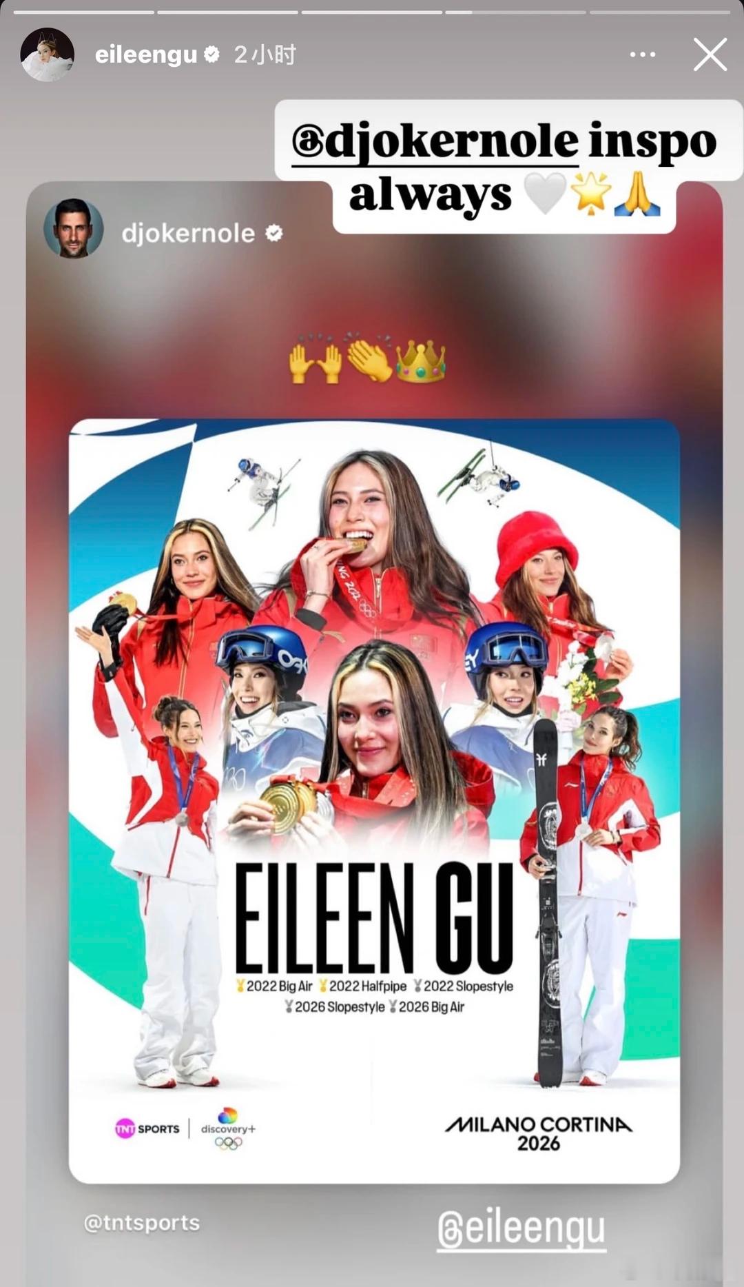 德约科维奇在奥运会期间发ins支持谷爱凌,并且在谷爱凌夺冠后再发ins祝贺!