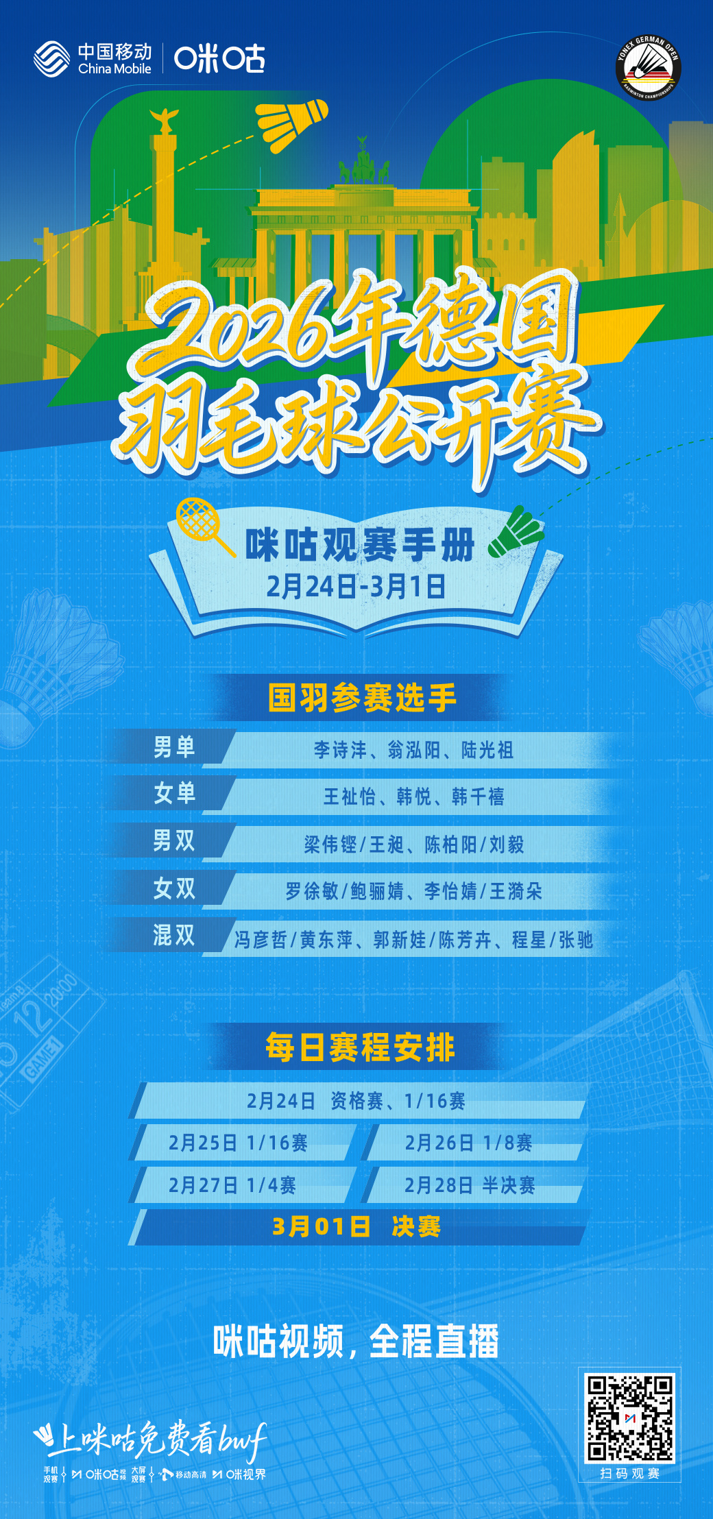 #2026年德国羽毛球公开赛# 即将开战!🏸 一键查收你的咪咕观赛手册🇨🇳 王祉怡 梁王组合 领衔出战▶️2月24日-3月31日 为国羽加油📺 #上咪咕免费看bwf# 网页链接