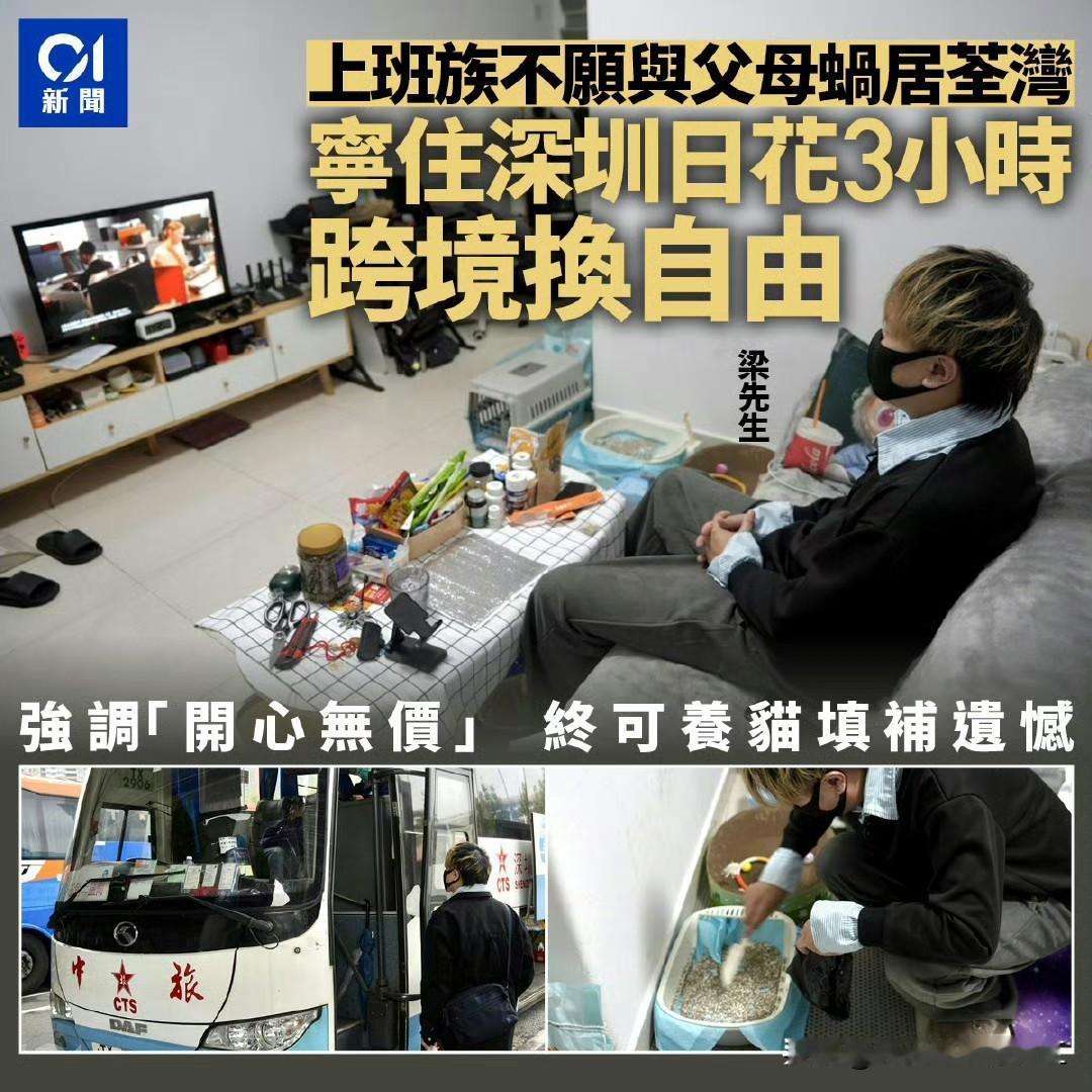 香港人梁先生自从搬到深圳之后,就爱上了深圳的生活,从深圳住所步行10分钟到口岸,然后乘坐直通巴往太子,再转乘港铁至公司所在的荔枝角,全程共约90分钟。 30多岁的梁先生自小与父母同住荃湾20平米的公屋,每天需要与家人争夺厕所,也不能养宠物,朋友及伴侣也不能探访家中。 月薪2万多元仅有限维持基本生活,除非花数千元租住劏房,否则难以独立居住,最终他在2024年决定搬到深圳,面积40多平米,租金4500元。 小区静中带旺,不仅开有多间便利店及食肆,而且从家里步行至皇岗口岸只需10分钟,正适合他轮班工作至凌晨过关。 乘坐直通巴往太子,再转乘港铁至上班地点,全程共约90分钟,车费共计39.9元。但他表示在直通巴上可睡觉或玩手机,一点也不感到辛苦,强调「开心无价」。 梁先生对深圳外卖及网购的便利程度感到震惊,若以香港两大外卖平台为例,每餐花费约70元,反观内地美团可低至10多元,甚至日用品也毋须外出购买。 他出门前会计算好时间叫外卖,然后带回香港至用餐时间翻热进食,日用品则购自淘宝或拼多多,售价远低于香港超市,每月可节省最少3,000元。 除了节省开支外,梁先生也开始尝试过去30多年无法实现的愿望,由于居所面积狭小及父亲洁癖不喜欢动物,自小未曾养过宠物。 加上家规严厉,禁止带外人进入家门,导致他也没有与朋友或伴侣在家玩乐的回忆,如今他已开始养猫,香港的朋友假日北上玩乐时也会登门借宿一宵,终可填补内心遗憾。 梁先生表示,到深圳居住还有一个更方便的,就是跟女朋友亲热无需再外出租酒店,他期望未来继续在深圳居住,积极考虑在深圳寻找发展对象。 梁先生表示,部分朋友了解他多姿多彩的生活后,也深深受到吸引。 来源香港“CI 新闻”(香港01)