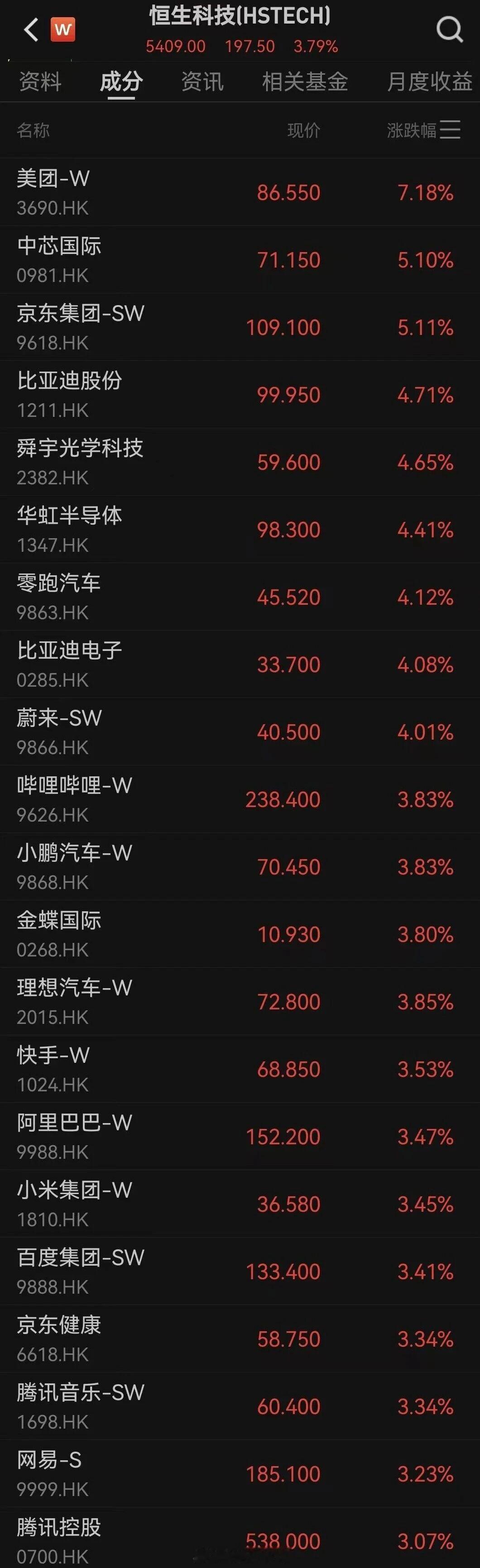 美团涨超8%、京东、中芯国际涨超5%,华虹半导体涨近5%,阿里巴巴、腾讯、百度、网易涨逾3%