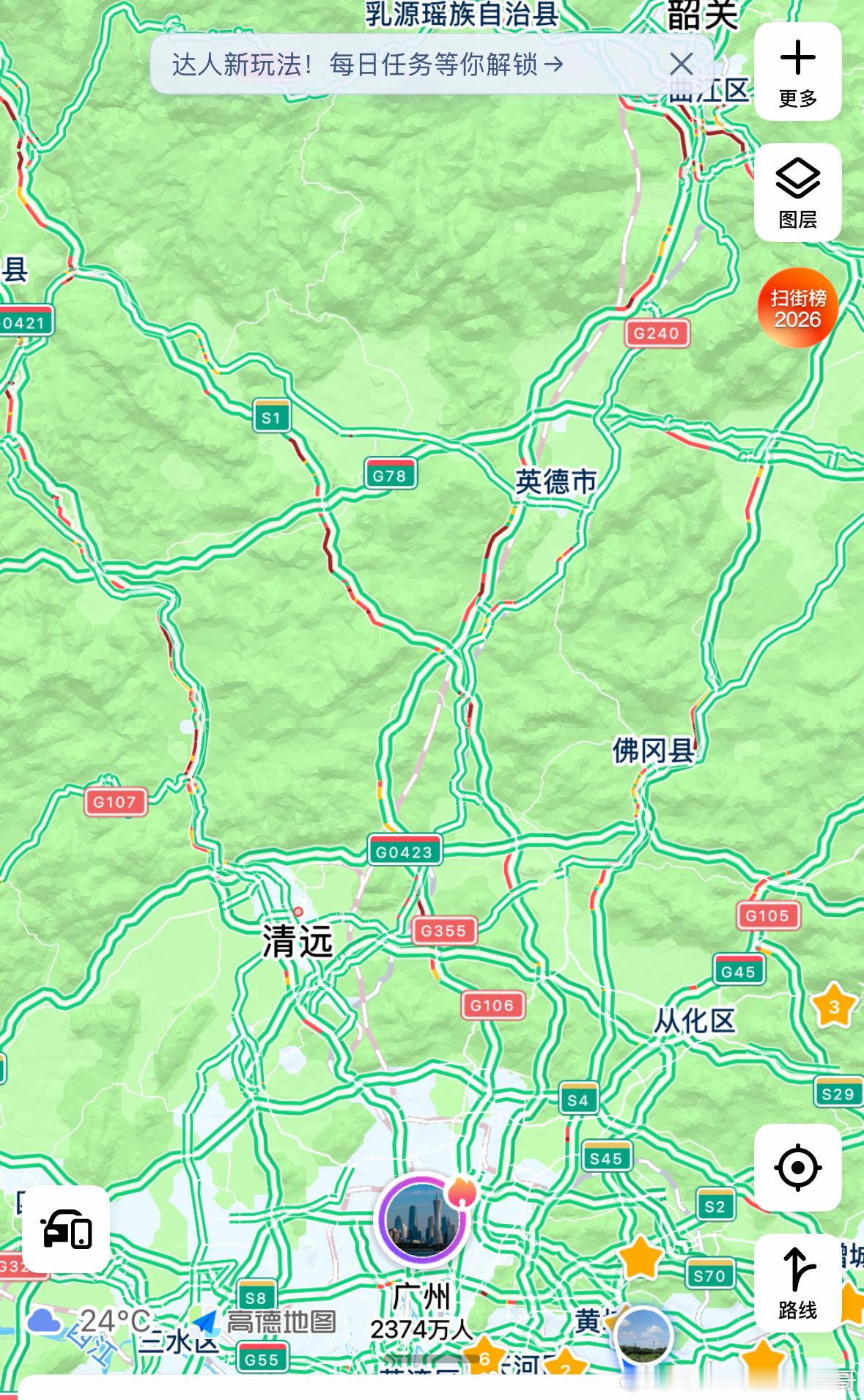 打开地图了才发现,北部方向进广州的高速真的是红通通的。