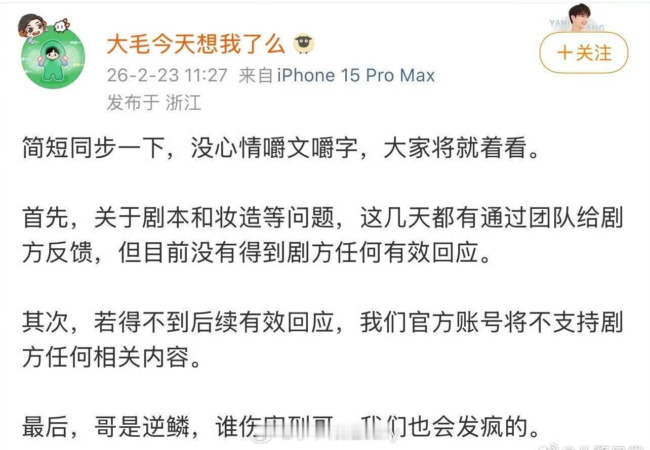 杨洋发博了:专注角色,尽全力完成好每一场戏