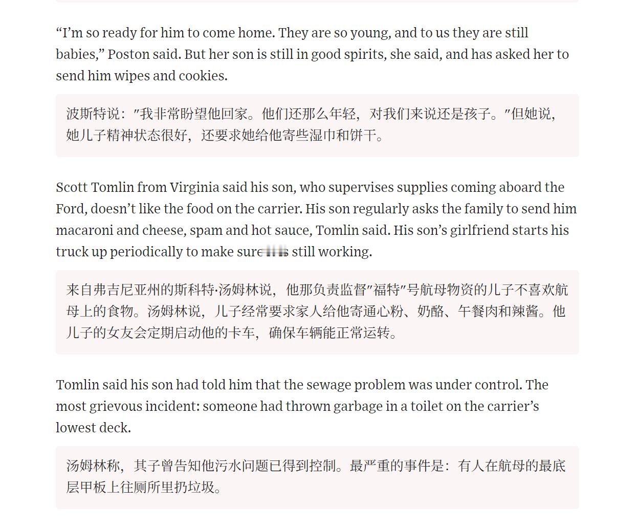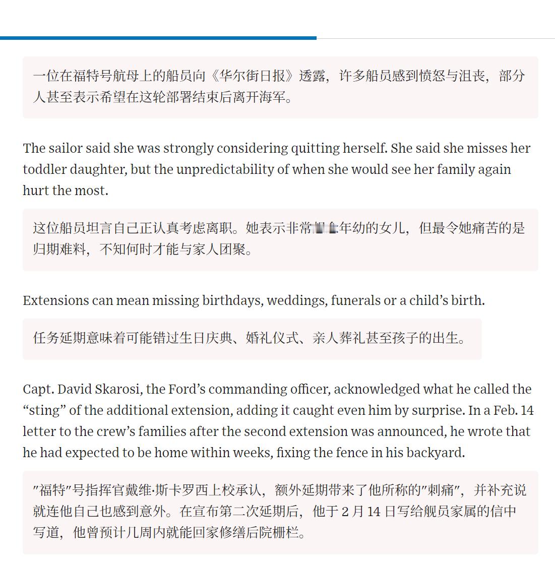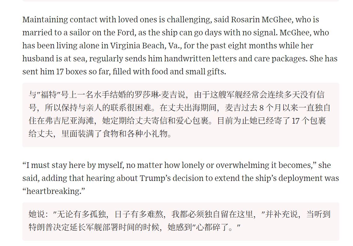 🔻一位在福特号航母上的船员向《华尔街日报》透露,许多船员对额外延期部署感到愤怒与沮丧,部分人甚至表示希望在这轮部署结束后离开美国海军。🔻家住宾夕法尼亚州的杰米·普罗瑟告诉《华尔街日报》,他的儿子是"福特"号航母上的飞行甲板管制员,普罗瑟的儿子有两个孩子,但他的父亲说,在福特号航母当前部署期间,儿子错过了曾祖父的葬礼、姐姐的离婚以及弟弟的健康问题。他还一直无法对自家的房子进行必要的修缮,比如给外部装饰刷漆。🔻“福特”号指挥官戴维·斯卡罗西上校承认,额外延期带来了他所称的"刺痛",并补充说就连他自己也感到意外。在宣布第二次延期后,他于 2 月 14 日写给舰员家属的信中写道,他曾预计几周内就能回家修缮后院栅栏。🔻什么玩意儿?为国打仗的军人,家里的栅栏还得等从前线回来修?漆还得自己回来刷?湿巾纸、通心粉、奶酪、午餐肉和辣酱都得靠家里人往前线寄?🔻你们的前方物资保障体系和后方社区组织体系都崩溃了吗?🔻你们美国这斩杀线也太具体了吧?特朗普开始报复了海外新鲜事热点现场伊朗