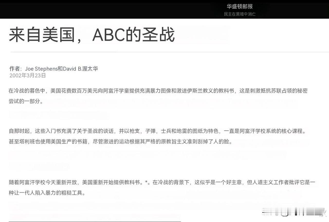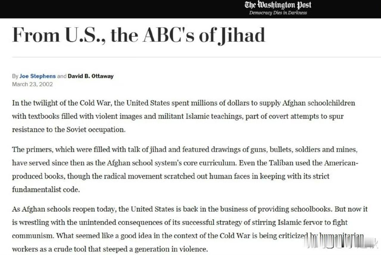 当年苏联入侵阿富汗时,美国为了让阿富汗拖死苏联,向阿富汗儿童散发了大量极端书籍 现在统治阿富汗的塔利班,正是读着美国人的书长大的,但现在美国却反过来指责塔利班是恐怖组织,所以到底谁才是恐怖组织?