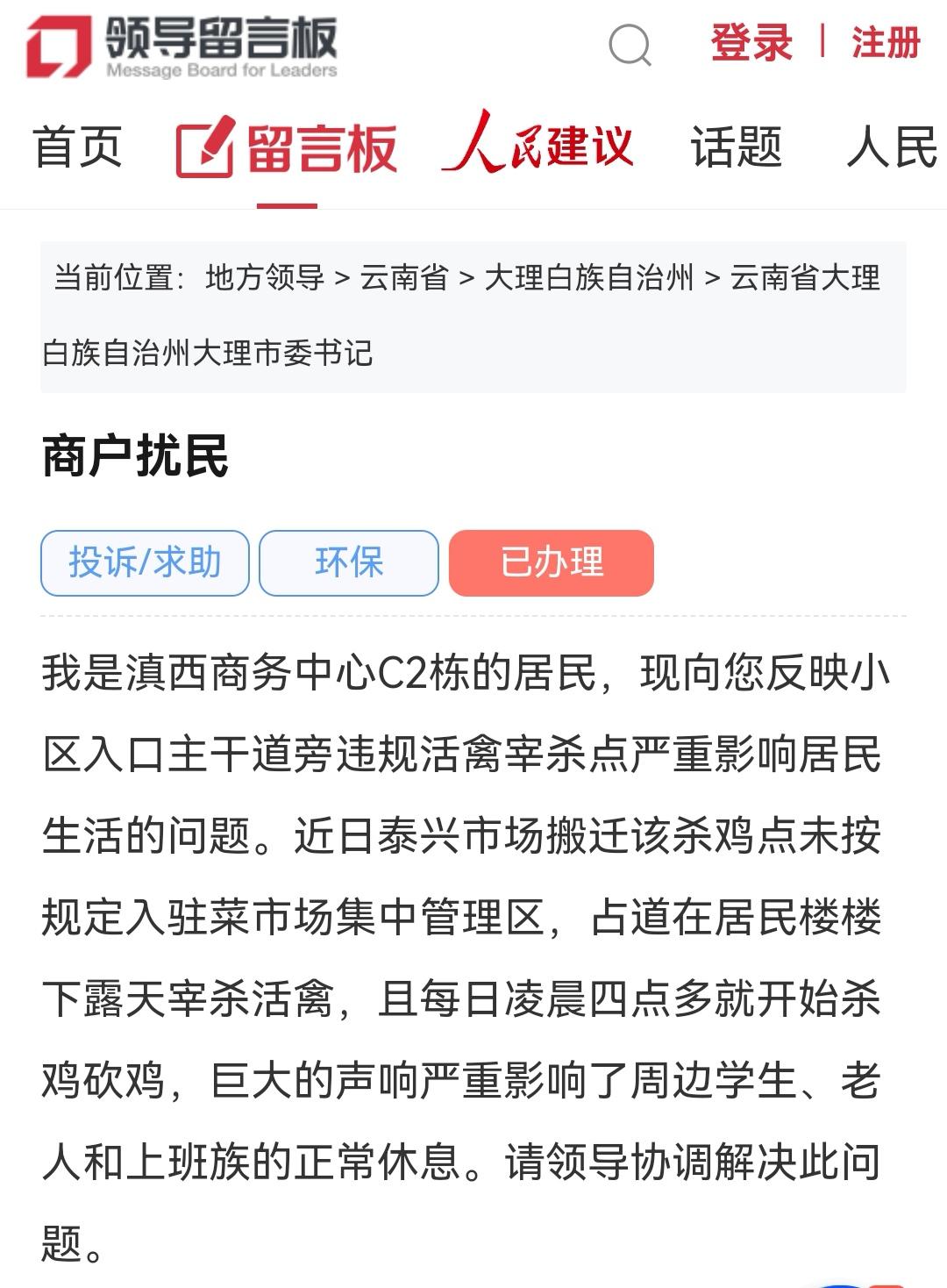 大理网民反映滇西商务中心活禽宰杀问题,官方回复→ ✍📩近日大理网民通过领导留言板向市委书记留言: ▶️商户扰民 我是滇西商务中心C2栋的居民,现向您反映小区入口主干道旁违规活禽宰杀点严重影响居民生活的问题。近日泰兴市场搬迁该杀鸡点未按规定入驻菜市场集中管理区,占道在居民楼楼下露天宰杀活禽,且每日凌晨四点多就开始杀鸡砍鸡,巨大的声响严重影响了周边学生、老人和上班族的正常休息。请领导协调解决此问题。 2026-02-14 19:00 📢📩大理市农业农村局官方回复 尊敬的网友: 您好!您通过人民网反映的“滇西商务中心活禽宰杀”问题,经我局调查核实后,回复意见如下: 一、滇西商务中心原共有6家白条鸡经营户,经我局配合天城物业劝导,现已搬离3家,剩余3家因退租方式未谈妥还未搬离,但小区内的噪声、违规占道经营情况已有改善。 二、接下来我局将继续配合天城物业做好租户和业主的思想工作,引导经营户转型发展或加强经营管理,降低对小区业主造成的影响。 在今后工作开展过程中,我们将以更加严谨、细致、务实的态度推进各项工作,改进工作作风,确保政策宣讲到位、程序公开透明、诉求渠道畅通。进一步牢固树立以人民为中心的发展思想,全力做好经济发展、产业谋划、群众增收等工作。 再次感谢您和广大网友的监督与建言,这必将帮助我们更好地改进工作、服务人民。祝您身体健康,生活愉快。