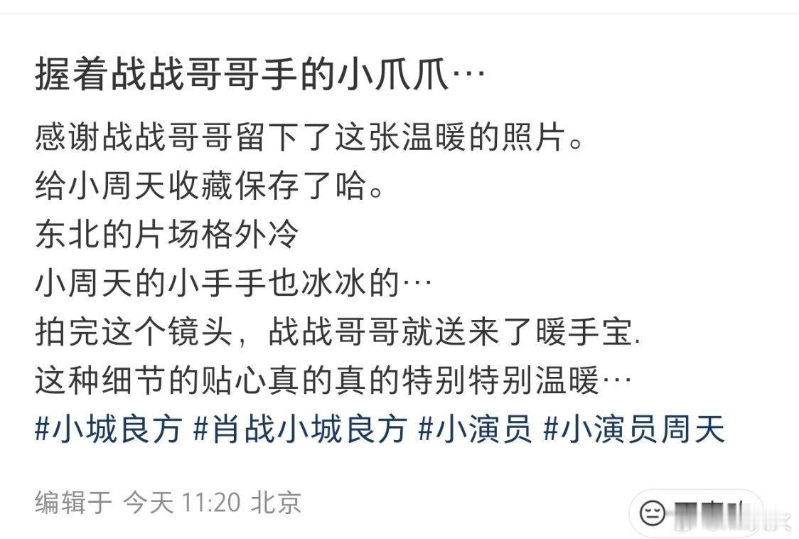 东北的片场格外冷,但是天使肖战很暖。肖战拍戏时被7岁小演员的“小冰爪爪凉到了”,拍完图2这个镜头马上给小演员送了暖手宝,天呐!!等我小了