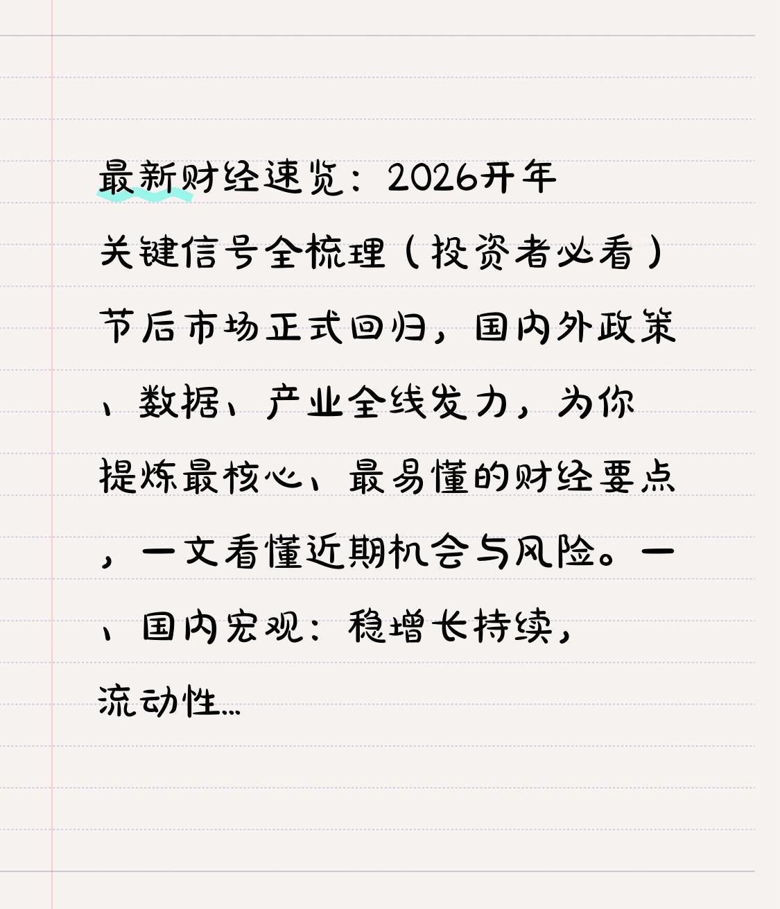 最新财经速览:2026开年关键信号全梳理(投资者必看) 节后市场正式回归,国内外政策、数据、产业全线发力,为你提炼最核心、最易懂的财经要点,一文看懂近期机会与风险。 一、国内宏观:稳增长持续,流动性宽松 1. 央行护航流动性 节后央行加大资金投放,市场流动性保持充裕,为A股和实体经济提供支撑。 2. LPR维持不变 最新贷款市场报价利率保持稳定,房贷、企业融资成本延续低位,稳楼市、稳经济基调明确。 3. 经济复苏向好 春节消费数据亮眼,制造业景气度回升,内需复苏成为今年核心主线。 二、A股市场:资金蓄力,主线清晰 1. 马年开市资金充足 公募基金待建仓资金超900亿,节后市场资金面偏暖。 2. 再融资政策优化 利好科技、科创类企业,成长板块长期受益。 3. 核心投资主线 AI算力/光模块:订单饱满,产能满负荷 低空经济、中药:政策密集发力 内需消费:复苏确定性强 风险提示:对美出口占比较高的行业短期承压 三、全球市场:关税落地,贵金属创新高 1. 美国加征关税生效 外贸、消费电子、光伏等板块需警惕短期波动。 2. 全球货币政策 美联储降息预期延后,欧、日维持紧缩基调。 3. 大宗商品 黄金、白银持续走强,刷新历史高位;原油小幅回调。 四、本周关键关注 1. 重磅财报:英伟达、百度、伯克希尔 2. 新股上市:北交所、创业板优质标的 3. 汇率走势:人民币维持强势区间 总结 2026开年经济复苏、政策友好、资金充裕,科技成长+内需消费仍是核心方向,短期关注外贸相关板块波动,中长期把握政策与产业共振机会。