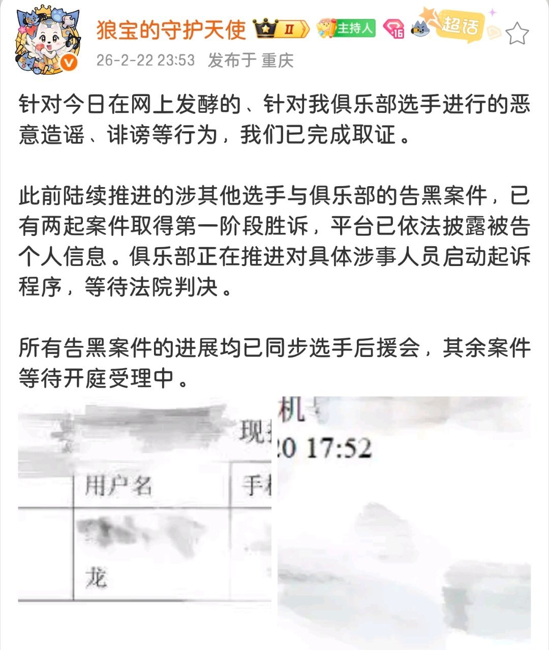 狼队针对俱乐部选手的恶意造谣诽谤已完成取证,此前两起告黑案取得第一阶段胜诉并披露被告信息,俱乐部正推进起诉,
