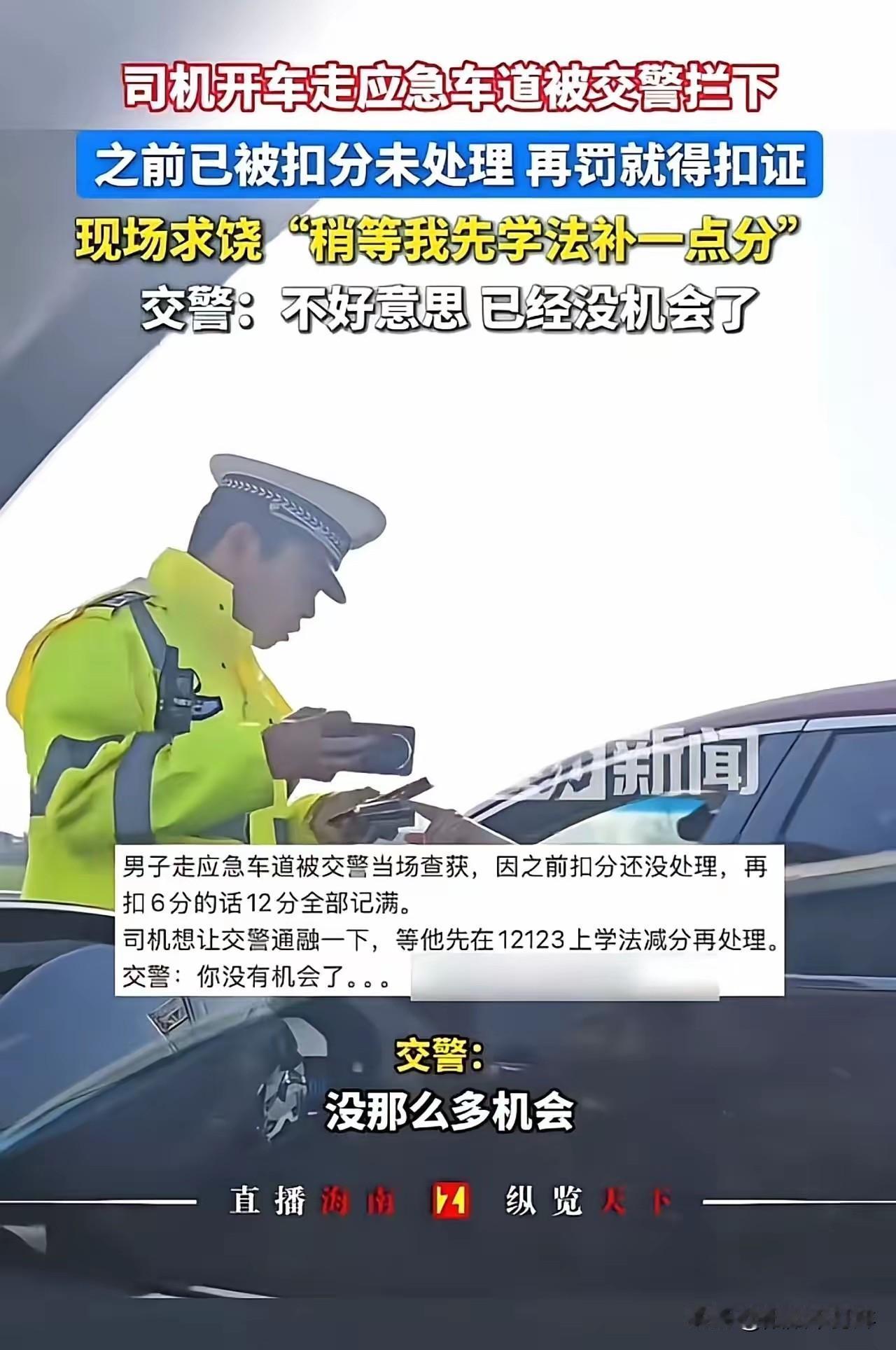 “这个交警太霸气了!”男子开车走应急车道被交警拦下,因为之前已有扣分未处理,再罚就得扣证。于是求饶:“能不能让我先学法补一点分,不然我就不能开车了……”交警:“不好意思,你已经没有机会了!” 网友:干得漂亮!这是抓住了,不然他次次如此! 2026年2月,高速交警在匝道设卡排查违章,当场拦下一辆占用应急车道的黑色轿车。司机称返程遇拥堵,抱着侥幸心理驶入应急车道,以为能避开监控。 交警核查发现,该司机此前有3次违章扣分未处理。本次占用应急车道需扣6分,叠加后驾驶证记分将满12分,按规必须暂扣。 司机当场慌神,提出先在12123APP学法减分,再接受处罚。他强调自己靠开车跑业务,扣证会影响全家收入,希望交警通融。 交警明确拒绝,执法记录仪记录显示,交警表示学法减分是补救措施,不是违章后的“退路”。未处理的旧违章,足以证明其漠视规则。 事件视频被发布后,引发全网热议。少数网友认为司机不易,应给予补分机会;多数网友支持交警,认为执法不能松动。 有网友爆料,近期春运返程高峰,多地出现应急车道被占的情况。有救护车因被堵,延误了急症患者的救治时间,相关话题已登上本地热搜。 交警部门同步发布数据,2026年春运以来,辖区已查处占用应急车道违法行为120余起,其中15%的司机存在未处理旧违章。 本次处罚不存在裁量空间,满12分暂扣驾驶证是明文规定。交警的执行,是对规则的维护,也是对公众安全的负责。 司机最终在处罚决定书上签字,驾驶证被依法暂扣。他需重新参加科目一考试,合格后才能取回证件。 应急车道是生命通道,这是交通法规的核心要求之一。任何时候,都不能以“方便自己”为理由,占用他人的生命通道。 学法减分的初衷,是督促驾驶员学法知法。将其当作违章“护身符”,本质是对政策的曲解。 执法必严,才能让规则深入人心。对屡教不改的违章行为妥协,就是对守法者的不公。 你认为,面对这类试图用学法减分钻空子的司机,交警该不该网开一面?遇到占用应急车道的行为,你会选择随手举报吗?