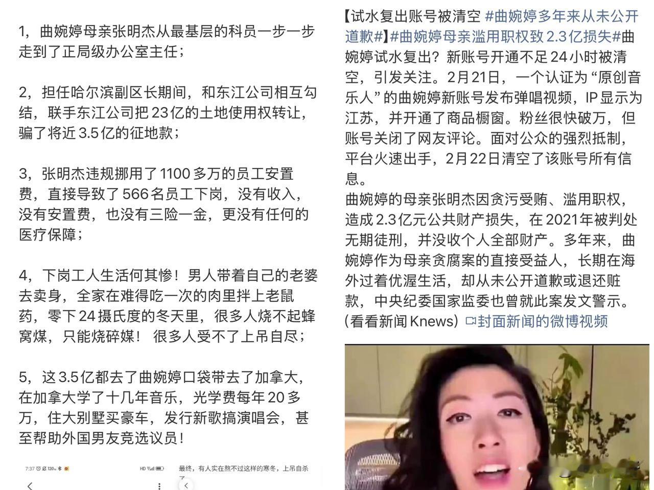 曲婉婷发了一条音乐视频后,24小时不到账号就被封了,真是喜闻乐见。 曲婉婷早年移民加拿大,近日以分享音乐为名在国内社交平台更新内容,结果遭到网友火速举报。不到一小时,她便关闭了评论区;又过了不到六小时,账号正式被封,现在已经搜不到了。 给大家介绍一下曲婉婷的母亲:原哈尔滨发改委主任张明杰,利用企业改制之机涉嫌贪污3.5亿元,2021年被判无期徒刑。曲婉婷随父亲在加拿大定居,赃款至今未追回。而当年被卷走的这笔钱,让很多东北下岗女职工被逼得跳楼走上绝路。2002年的3亿多,在当年是怎样的数字?是多少人的血泪钱! 曲婉婷一边享受着母亲涉案的赃款,一边在外媒采访中喊冤,称她妈妈是“英雄”。可那些钱,至今一分都没吐出来!中纪委曾发文强调"境外不是资产转移天堂",点名批评曲婉婷母女转移赃款行为。公众共识认为:贪腐利益链的共谋者无权享受社会舞台。 现在拍视频美其名曰分享音乐。如今村村通网,她妈做的那些事,大家都知道了。当一个家庭的财富积累建立在另一个家庭的绝望之上时,这个家庭的成员若想获得社会认可,恐怕首先要做的不是创作“我的歌声里”,而是思考如何偿还“我的原罪里”。