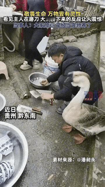 万物有灵!贵州,一男子在除夕当天准备杀鹅添道年味,谁知,家里一只大鹅竟紧紧跟着主人,之后还伸出鹅掌按住了主人磨刀的手,更让人意外的是,它还把掌紧紧踩在刀面上,凑过脖子一个劲蹭主人的胳膊,那副黏人讨好的样子,似乎在打消主人宰杀它的念头! 磨刀石上的金属声刚响了两下,那只白鹅就晃晃悠悠地踱过来了。 刘先生没当回事。除夕的贵州农家院里,阳光懒洋洋地铺在地上,他蹲在墙根磨刀,心里盘算着一会儿怎么把这鹅收拾利索。常年在外打工,难得回趟老家,老人说要宰只鹅给晚辈们补补,他二话没说就把活儿接了过来。 刀钝,得先磨。他瞥了一眼院子里那只养了三年的大白鹅,心想:等着吧你。 然后,诡异的事情发生了。 那鹅没跑。它不仅没跑,还一步一步挪到刘先生跟前,歪着脑袋跟他对视了足足好几秒。刘先生愣住的工夫,一只橘红色的鹅掌已经稳稳当当地按在了他握刀的手上。 他还没反应过来,鹅又调整了一下站位,把掌心挪到刀面上,用力踩实。 那力道,分明是认真的。 刘先生磨不动了。他盯着这只鹅,脑子里转过一个念头:它知道。 接下来的画面更让他招架不住——大鹅把脖子伸过来,贴着他的手臂蹭,蹭完手臂蹭肩膀,蹭完肩膀往脸上凑。那姿态温顺得不像话,跟平时横着走路、见谁怼谁的德行判若两禽。 这哪是一只鹅,分明是个谈判专家。 它精准地识别出了威胁源——不是人,是刀。所以它没攻击刘先生,而是选择控制武器本身。物理手段用完,立刻切换情感攻势:撒娇、贴脸、黏人。一套组合拳打下来,刘先生的心理防线直接崩了。 他站起身,决定放过这只鹅,换一只杀。 没想到,那鹅跟上来了。 它挡在刘先生和鹅圈之间,脖子伸得笔直,摆出一副"要过去先踩过我"的架势。刘先生试图绕开,鹅掌一伸,啄住了他的裤腿,死活不松口。 这下刘先生彻底没脾气了。 它不只是在救自己,它还在护同伴。 一只鹅,能做到这个份上,你还能下得去手吗? 刘先生下不去。他跟父母商量了一下,得出一个结论:这鹅不杀了,以后当宠物养。 消息传到网上,评论区炸了。有人翻出自家的老故事:奶奶养了多年的公鸡,宰杀那天死命啄着裤腿,往怀里钻,最后也被放生了。类似的情节反复出现,仿佛某种民间叙事的固定模板——长期饲养、亲昵求饶、主人心软。 为什么这类故事总能戳中人? 大概是因为它满足了一种朴素的想象:生命与生命之间,是可以互相读懂的。你喂它三年,它记得你三年。当刀架在脖子上的时候,它能做的,就是用尽全力告诉你——我不想死,我知道你不忍心。 这不是本能,这是信任。 而人类的心软,往往不是被"可怜"打动,而是被"超出预期"击中。当一只鹅展现出仗义,它就不再只是一只鹅了。它变成了某种符号,某种关于善念的隐喻。 传统年味讲究大鱼大肉,丰盛为敬。但这个除夕,刘先生家的餐桌上少了一道鹅肉,却多了一个可以讲很久的故事。 那只大白鹅,现在大概还在院子里横着走路,见谁怼谁。 但它知道,有一把刀,永远不会再朝它磨了。